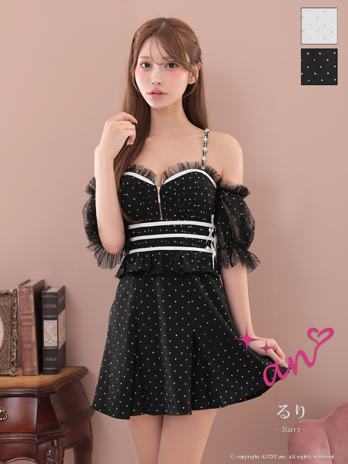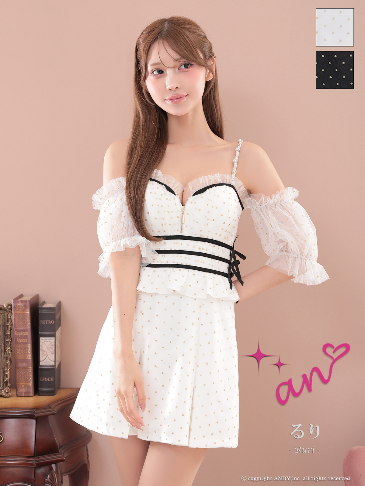 XSサイズあり【an /アン】ドット柄/ 袖付き/ フリル/ キャミ/ オフショル/ バストジップ/ ラインリボン/ フレア/ ミニドレス/ キャバドレス[OF05] [AOC3965-B-2508]