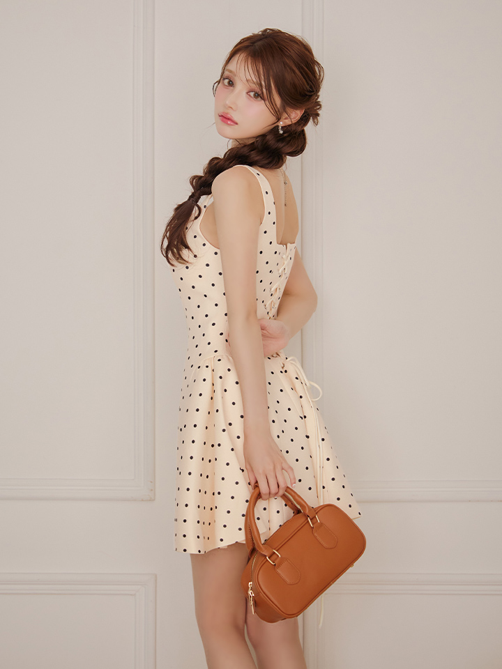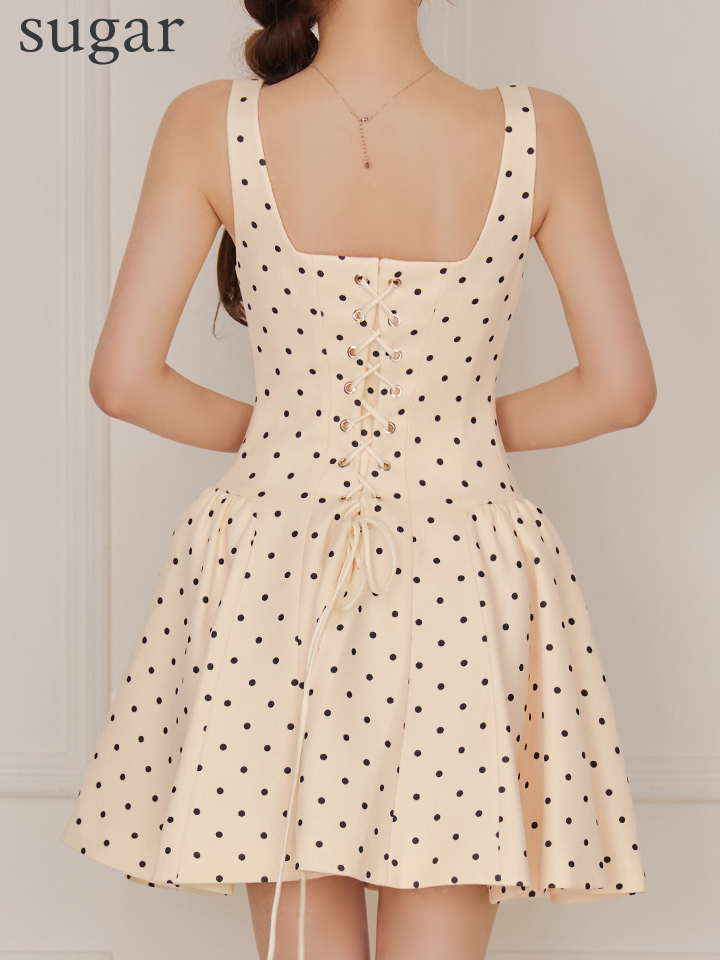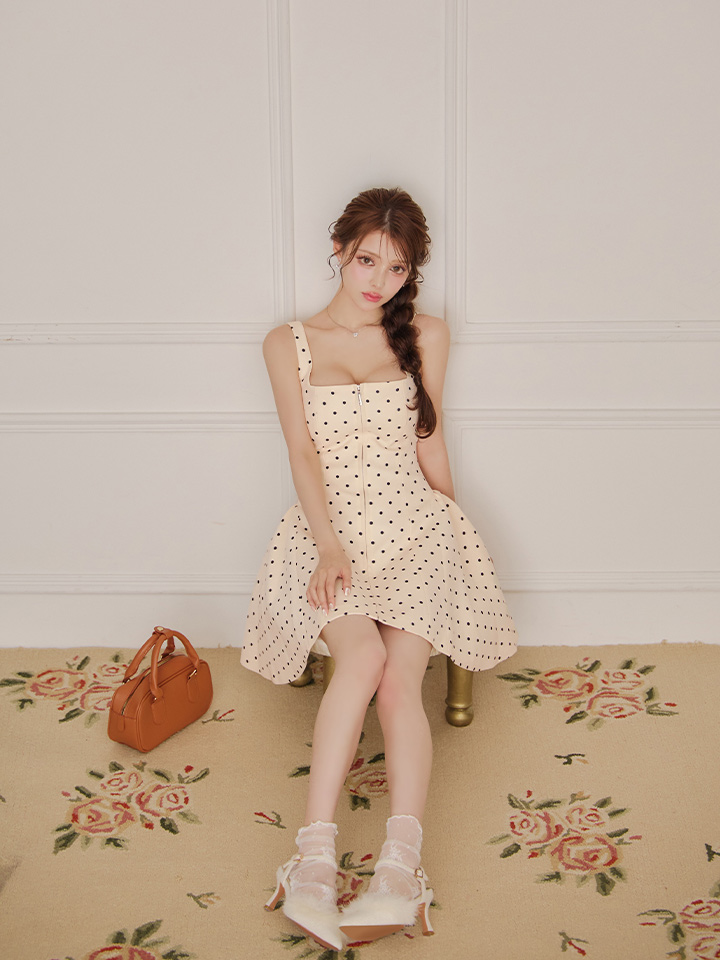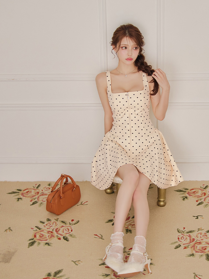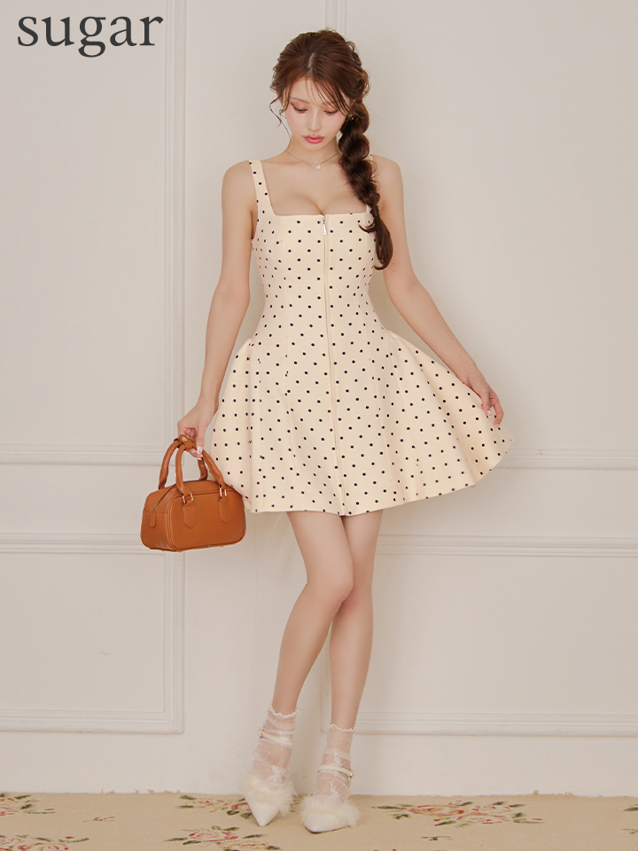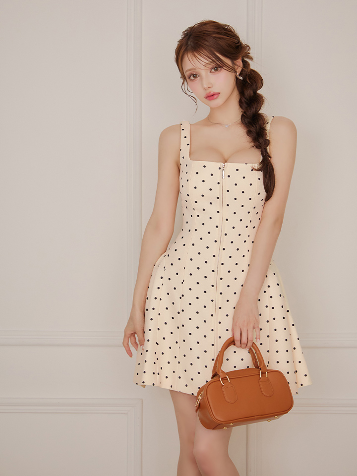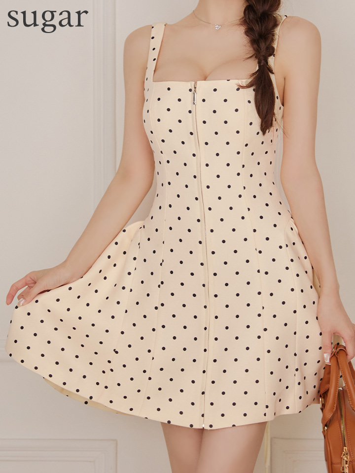 XS-Lサイズあり【ERUKEI エルケイ】ドット柄/ フロントジップ/ ノースリーブ/ バックスピンドル/ Aライン/ フレア/ ワンピース/ ミニドレス/ キャバドレス[OF2] [LKE25174-IVxB-S250829]