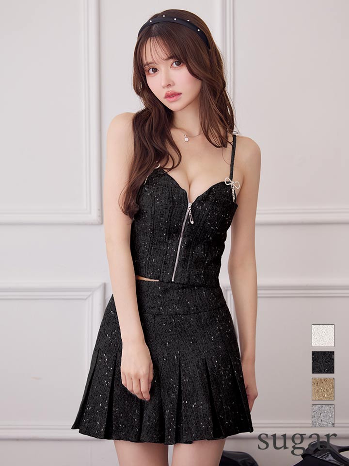 XSサイズあり【IRMA/イルマ】ミックスツイード/ フロントジップ/ リボンブローチ/ キャミソール/ プリーツ/ フレア/ セットアップ/ ミニドレス/ キャバドレス[OF2A]