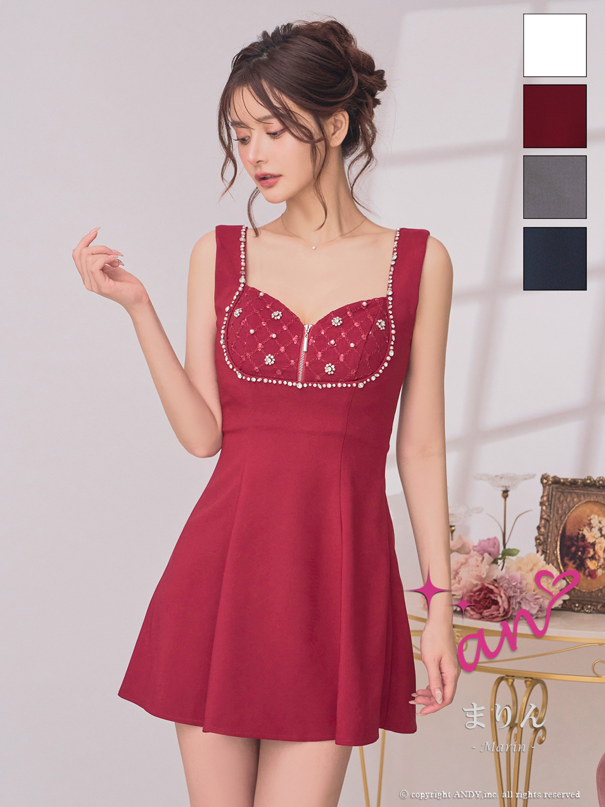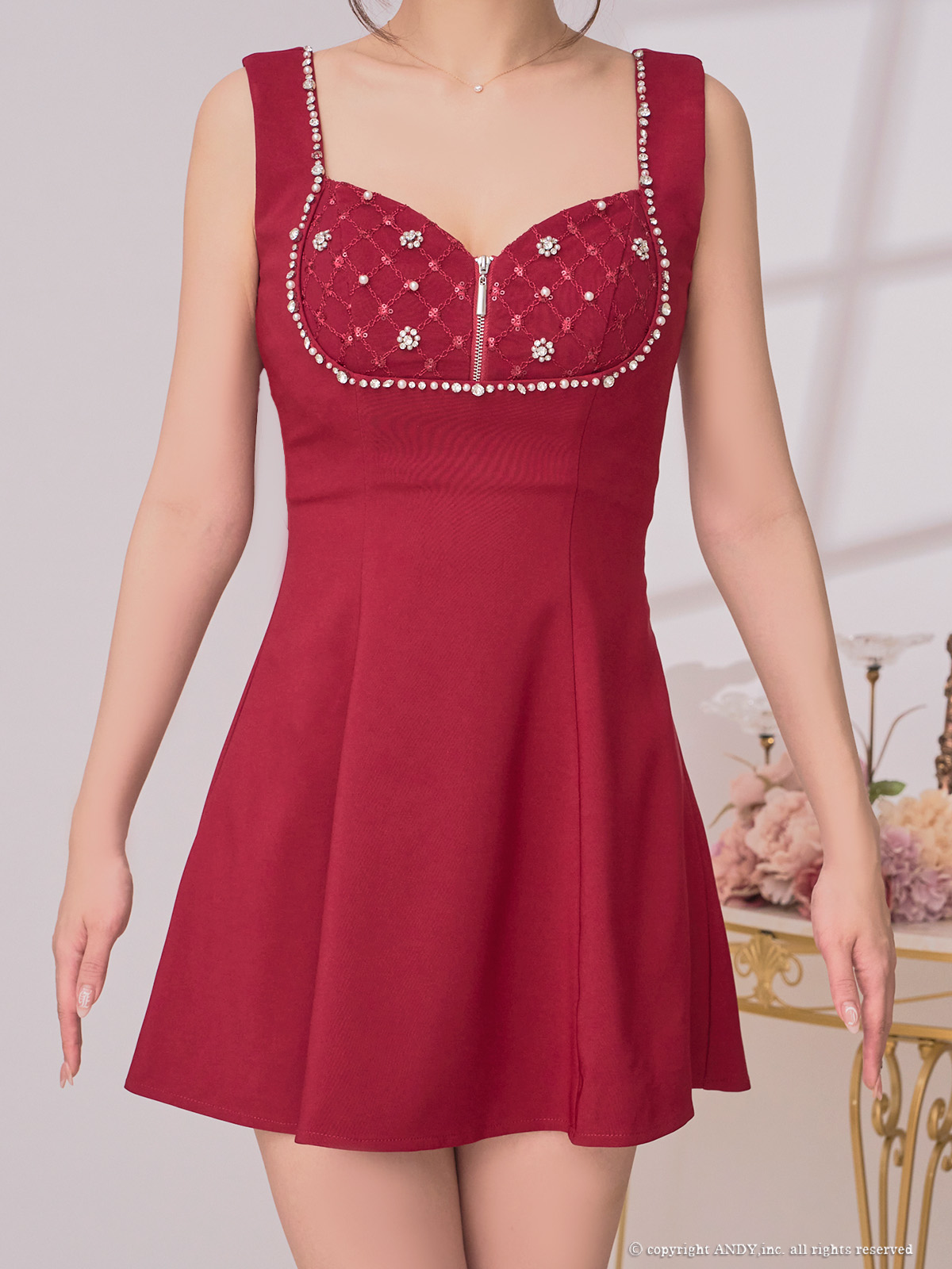 【an/アン】バストのビジューとダイヤ柄刺繍が上品なミニドレス♡