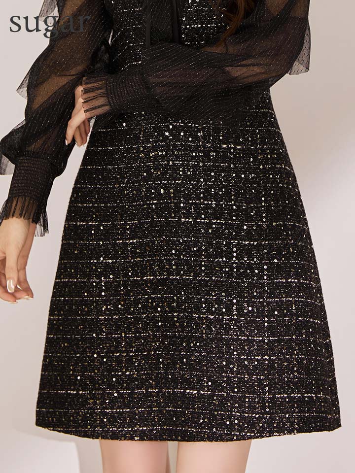 スパンコール付きラメツイードがきらきらと煌めく、華やかなワンピースミニドレス♡