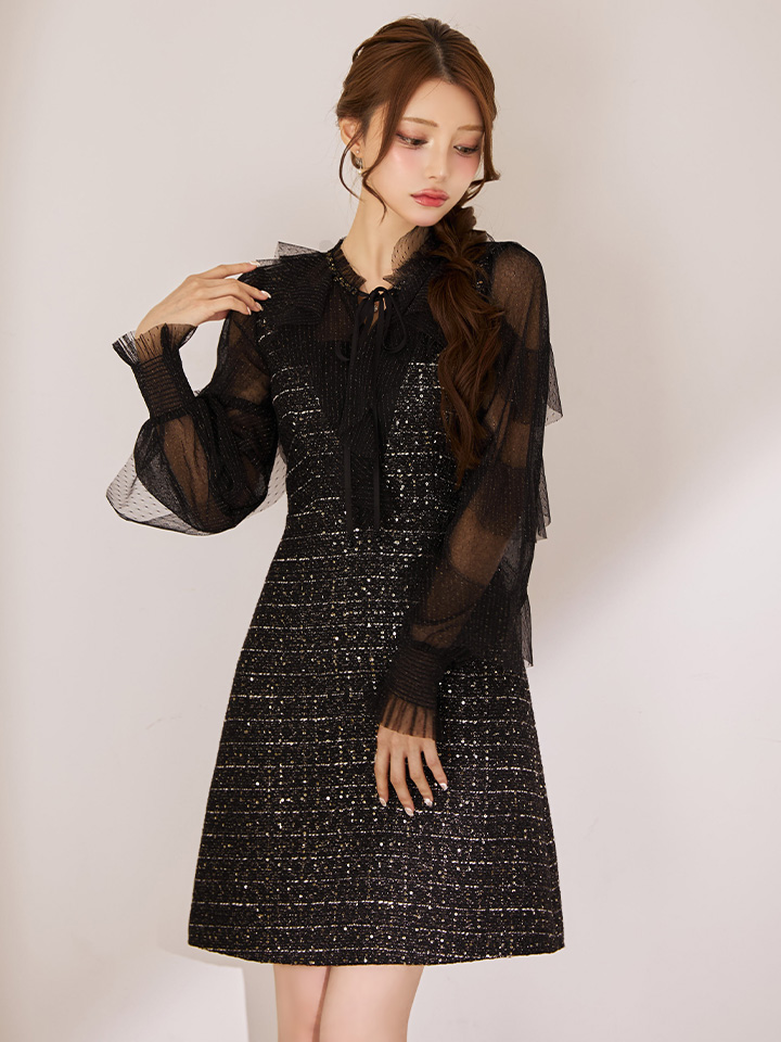- > XS-Lサイズあり 【GINZA COUTURE/銀座クチュール】スパンコール/ ラメツイード/ ネックリボン/ チュール/ ロングスリーブ/ フリル/ Aライン/ フレア/ ワンピース/ ミニドレス/ キャバドレス[OF2]