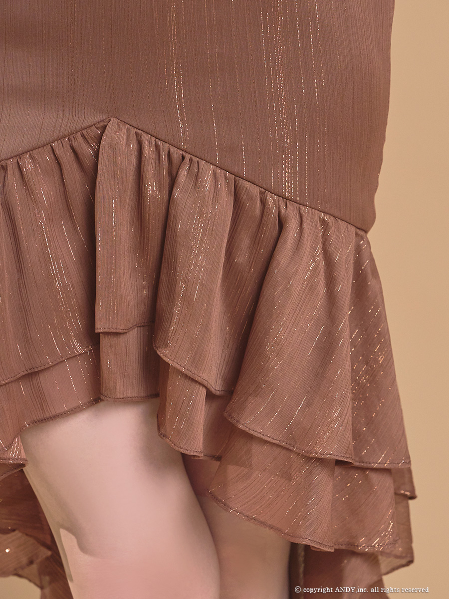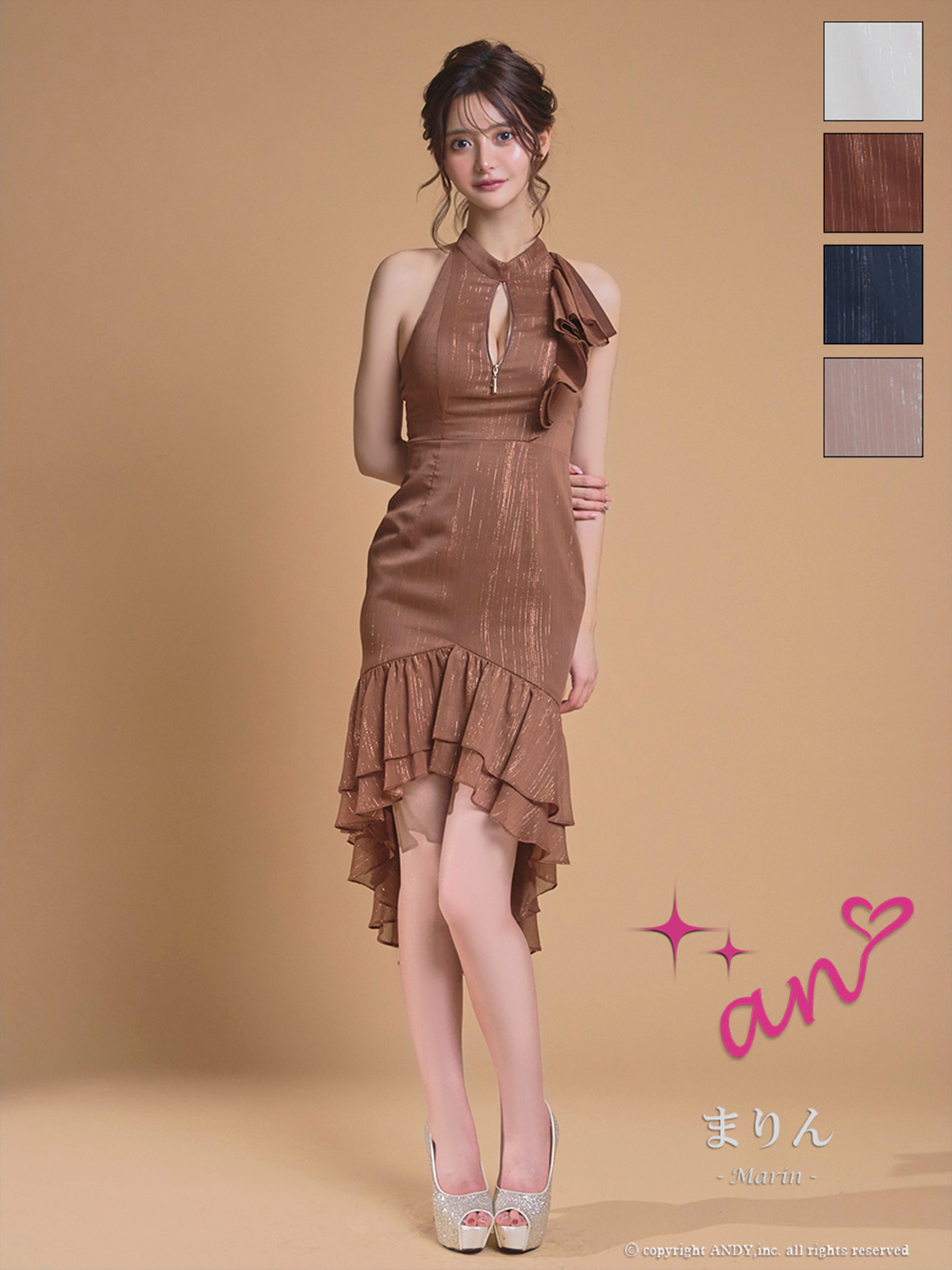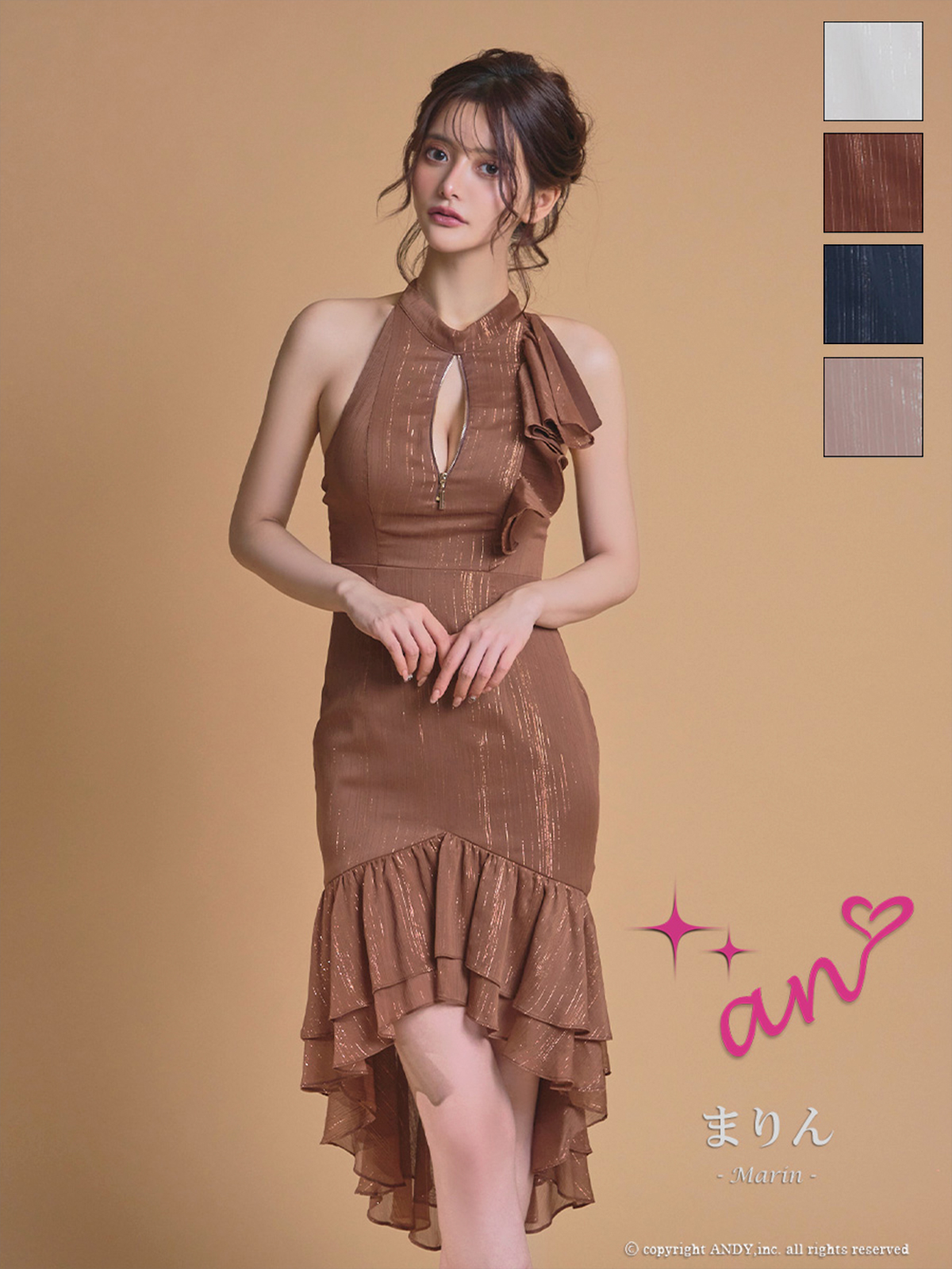 XSサイズあり【an /アン】ラメ/ ホルターネック/ バストジップ/ ショルダーフリル/ テールカット/ マーメイド/ ミディアムドレス/ キャバドレス[OF05] [AOC3971-BR-2509]