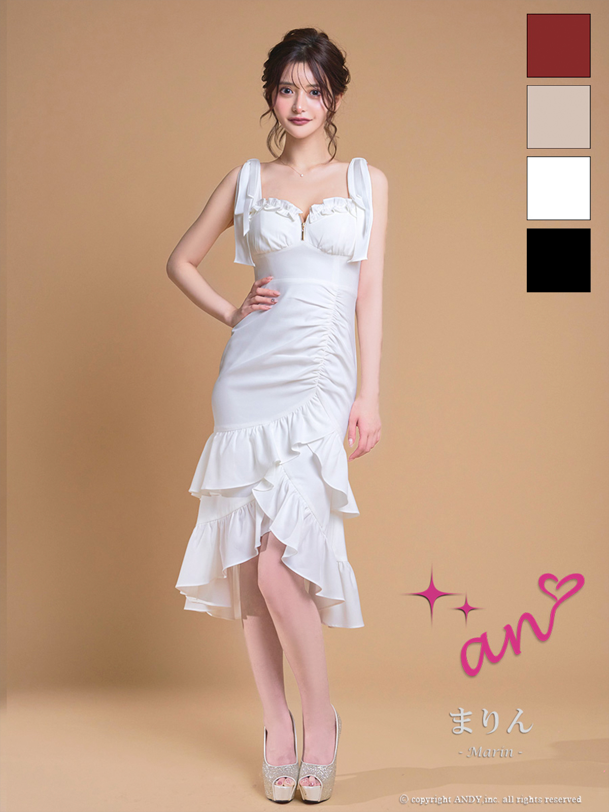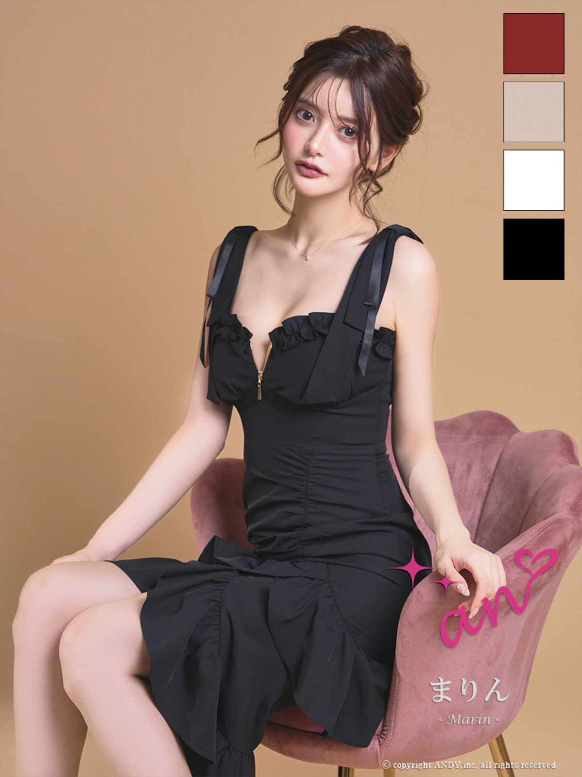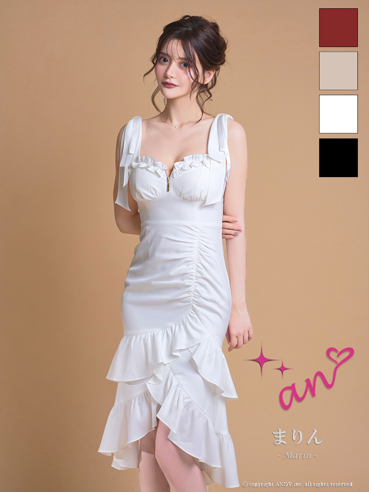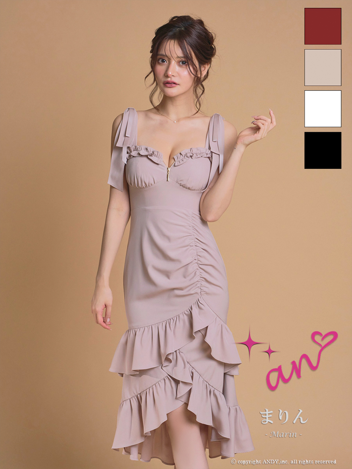 XSサイズあり【an/アン】ショルダーリボン/ バストジップ/ ノースリーブ/ フリル/ フレア/ ミディアムドレス/ キャバドレス[OF05] [AOC3972-WR-2509]