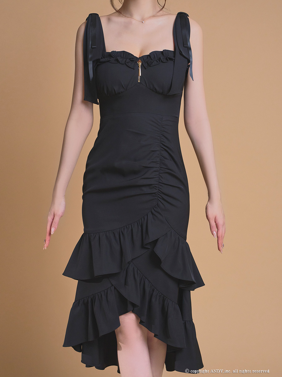 XSサイズあり【an/アン】ショルダーリボン/ バストジップ/ ノースリーブ/ フリル/ フレア/ ミディアムドレス/ キャバドレス[OF05]