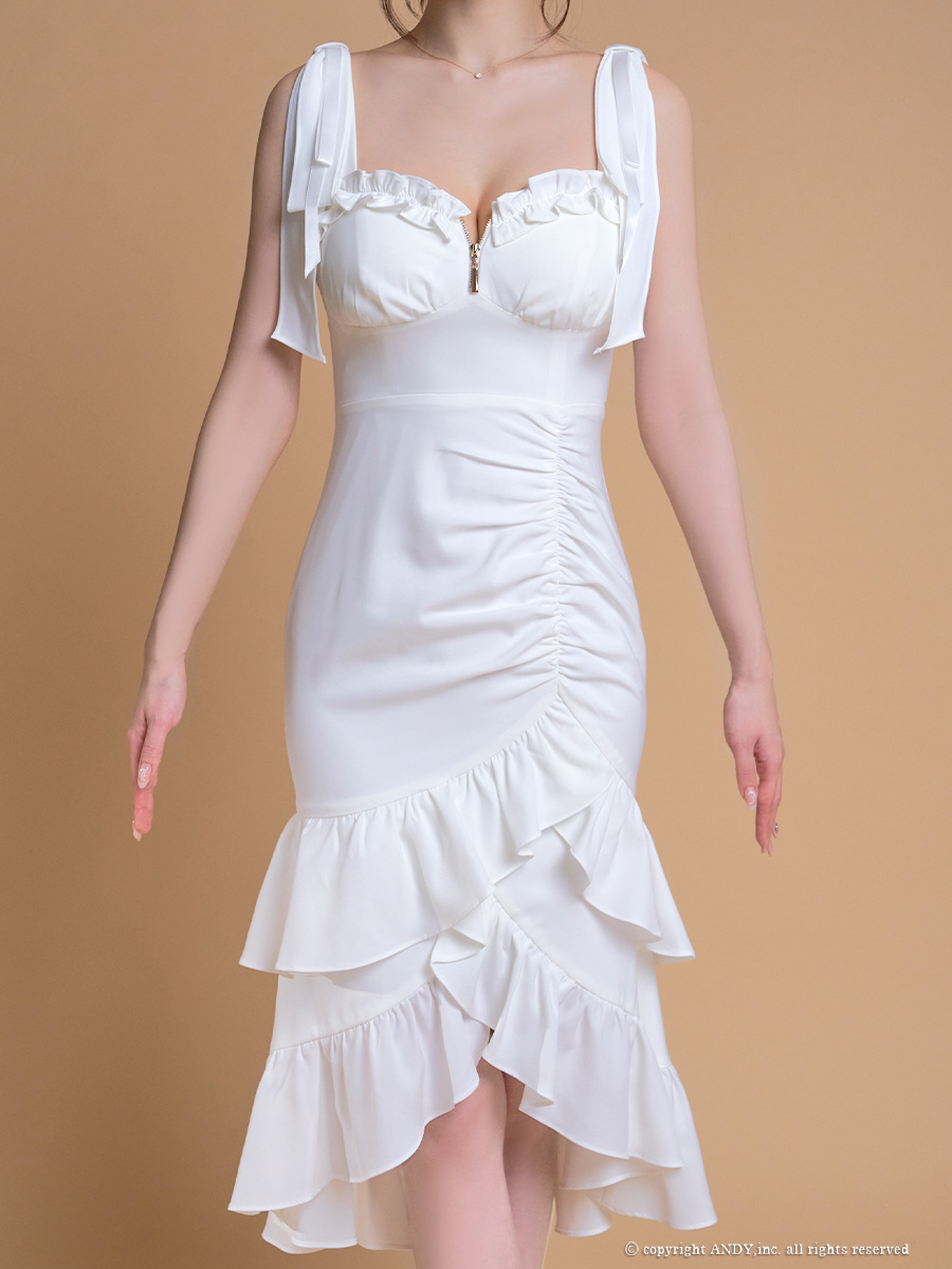 - > XSサイズあり【an/アン】ショルダーリボン/ バストジップ/ ノースリーブ/ フリル/ フレア/ ミディアムドレス/ キャバドレス[OF05]