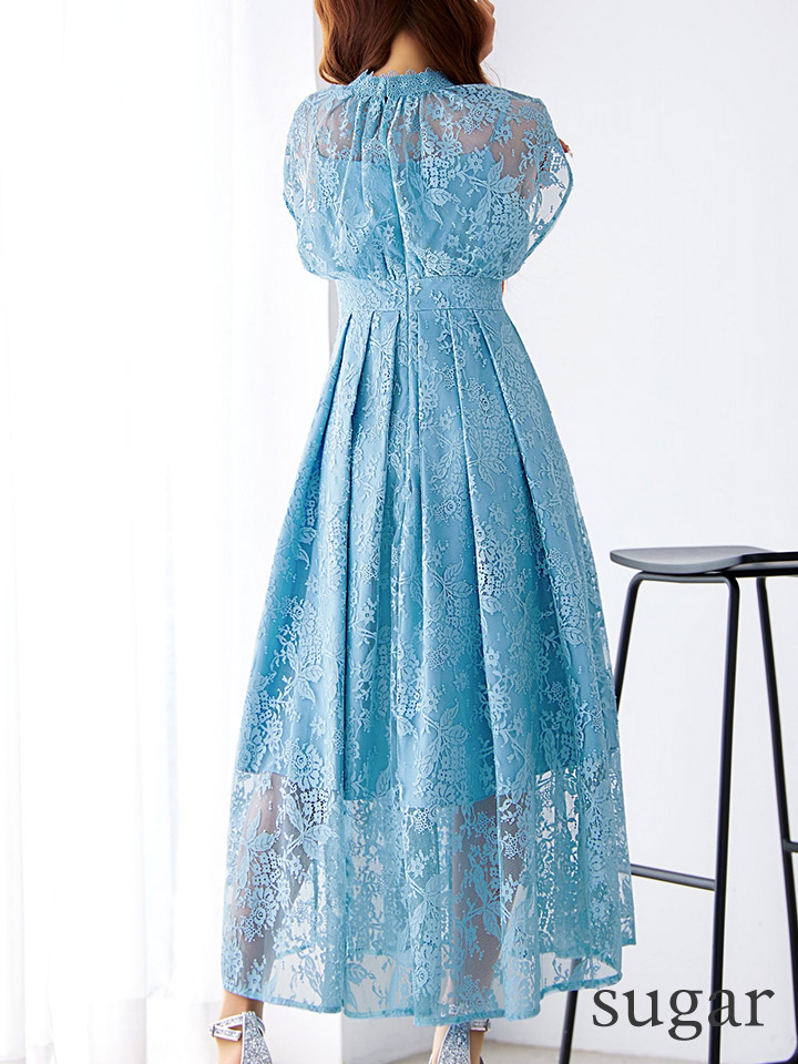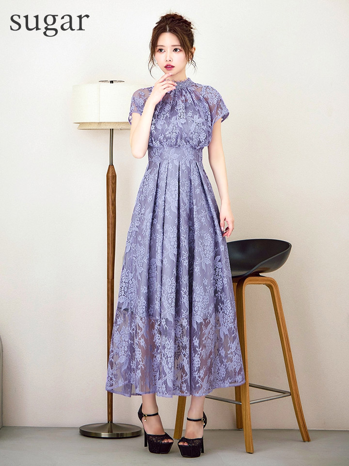 透け感のあるフラワーレースにハイネックが大人クラシカルな雰囲気のミモレ丈ワンピースドレス♡
