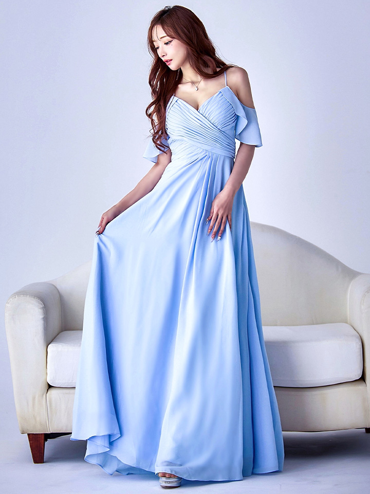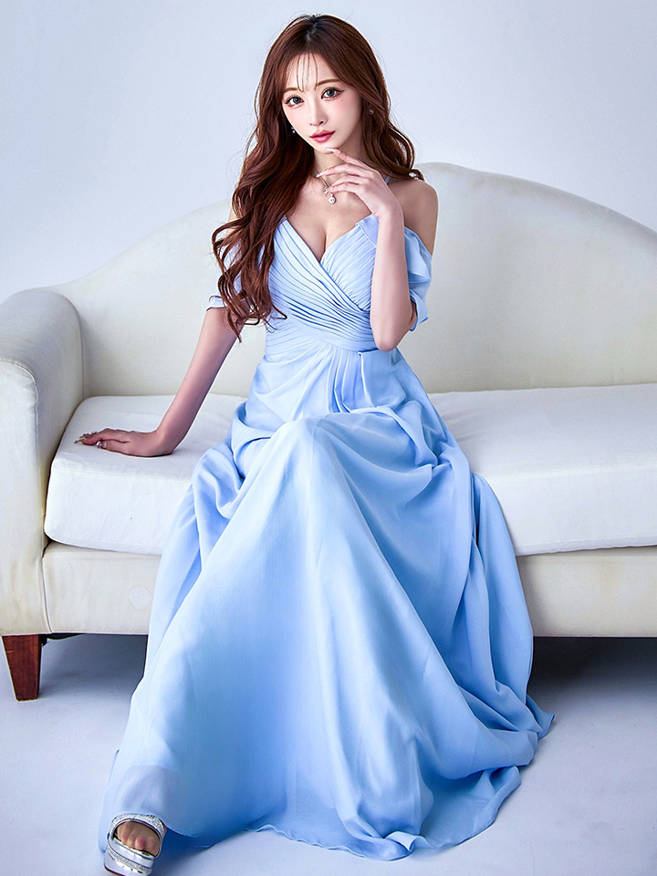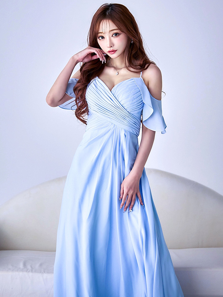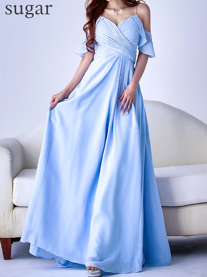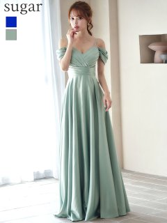 Lサイズあり【UNA VALERIE / ウナヴァレリェ】シンプル/ ワンカラー/ タック/ オフショル/ キャミソール/ フレア/ Aライン/ ロングドレス/ キャバドレス[OF05]