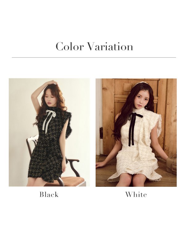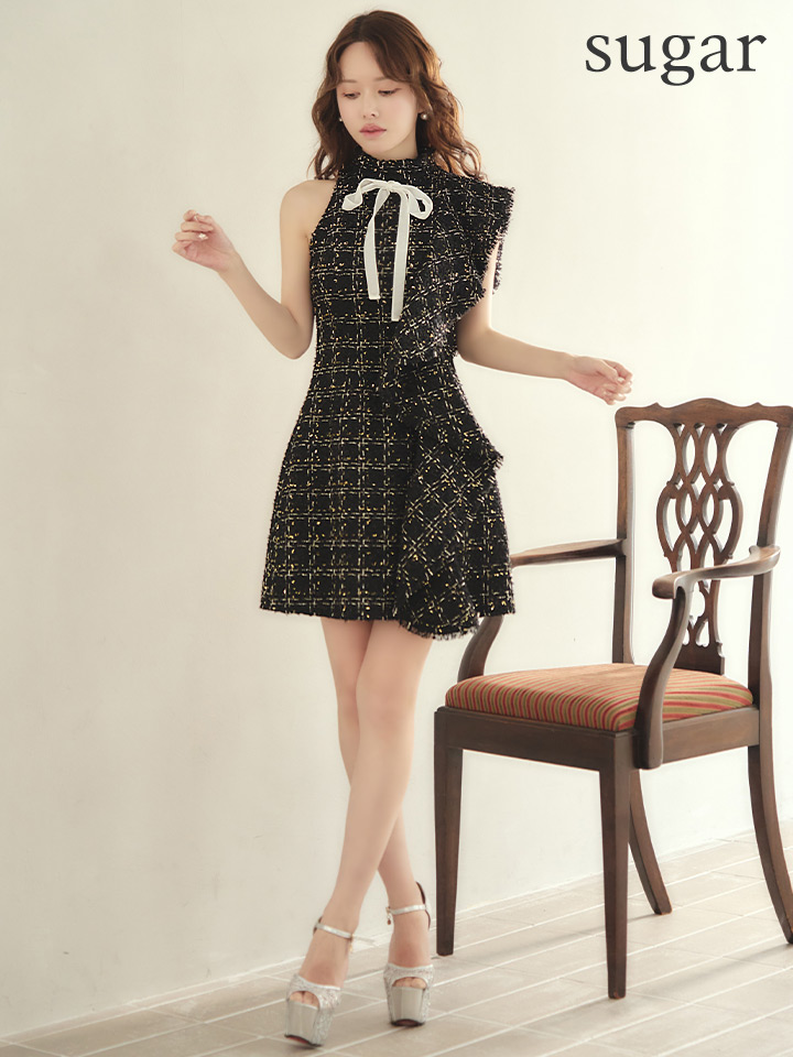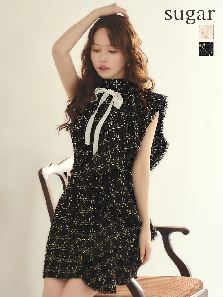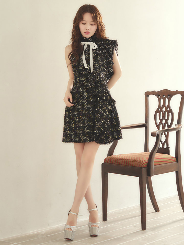 - > 【VELIQUE/ヴェリーク】ラメツイード/ ハイネック/ ネックリボン/ ノースリーブ/ フリル/ Aライン/ フレア/ ワンピース/ ミニドレス/ キャバドレス【HC02】