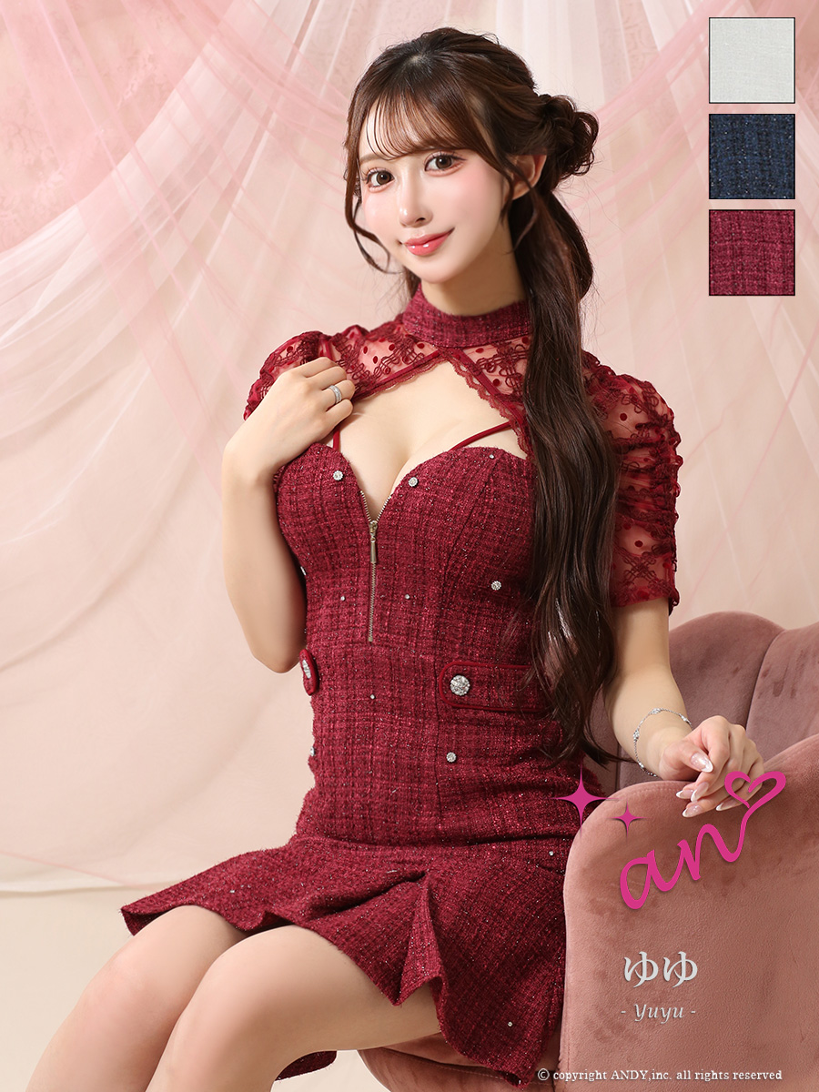 - > XSサイズあり【an /アン】ビジュー/ ツイード/ バストジップ/ ハーフスリーブ/ シアーレース/ 谷間魅せ/ プリーツ/ フレア/ ミニドレス/ キャバドレス[OF05]