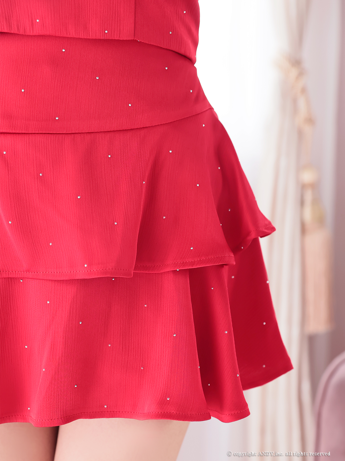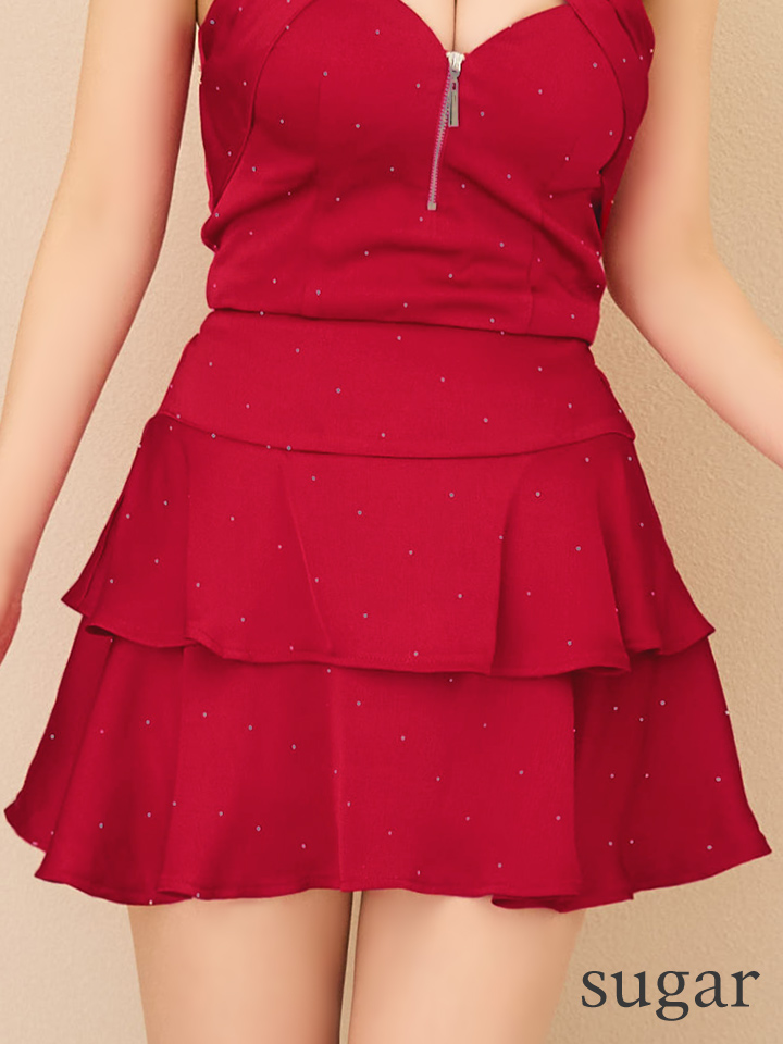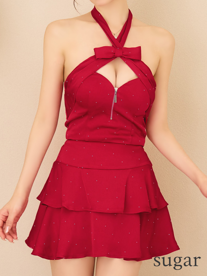 XSサイズあり【an /アン】ホルターネック/ リボン/ バストジップ/ ラインストーン/ 谷間魅せ/ セットアップ/ フレア/ ミニドレス/ キャバドレス[OF05] [AOC3996-R-S250917]