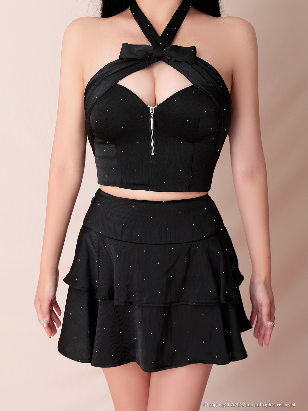 XSサイズあり【an /アン】ホルターネック/ リボン/ バストジップ/ ラインストーン/ 谷間魅せ/ セットアップ/ フレア/ ミニドレス/ キャバドレス[OF05]