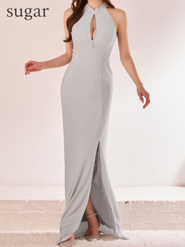 【MONOQLO/モノクロ】バックオープン/ アメスリ/ ビジューチェーン/ バストジップ/ スリット/ ノースリーブ/ ストレッチ/ ロングドレス/ キャバドレス/ long[OF05]