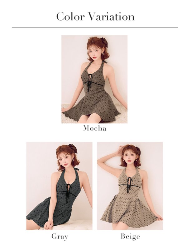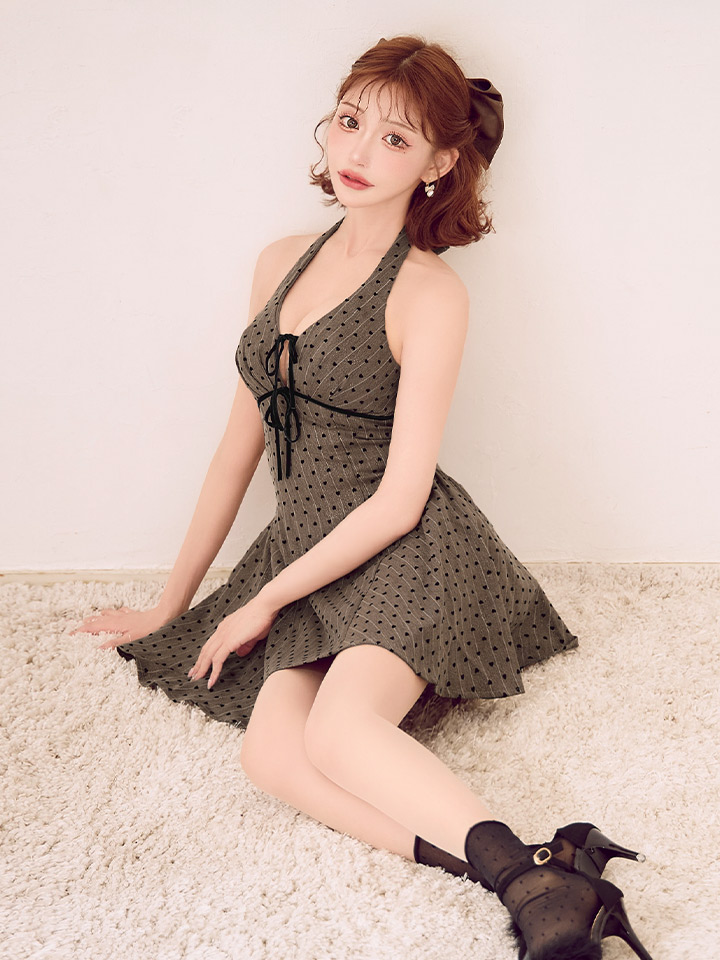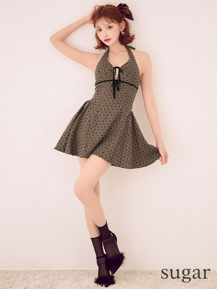 デコルテを美しく魅せるホルターネックと、レースアップのディテールが女性らしさを引き立てる一着。