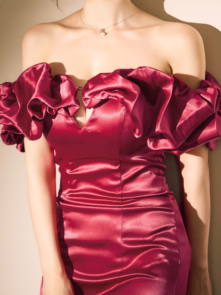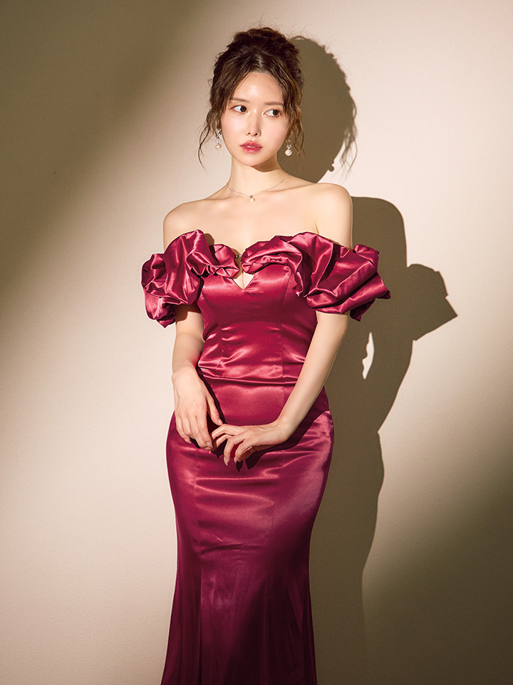 ボリュームたっぷりのスリーブデザインが特徴的なタイトロングドレス。