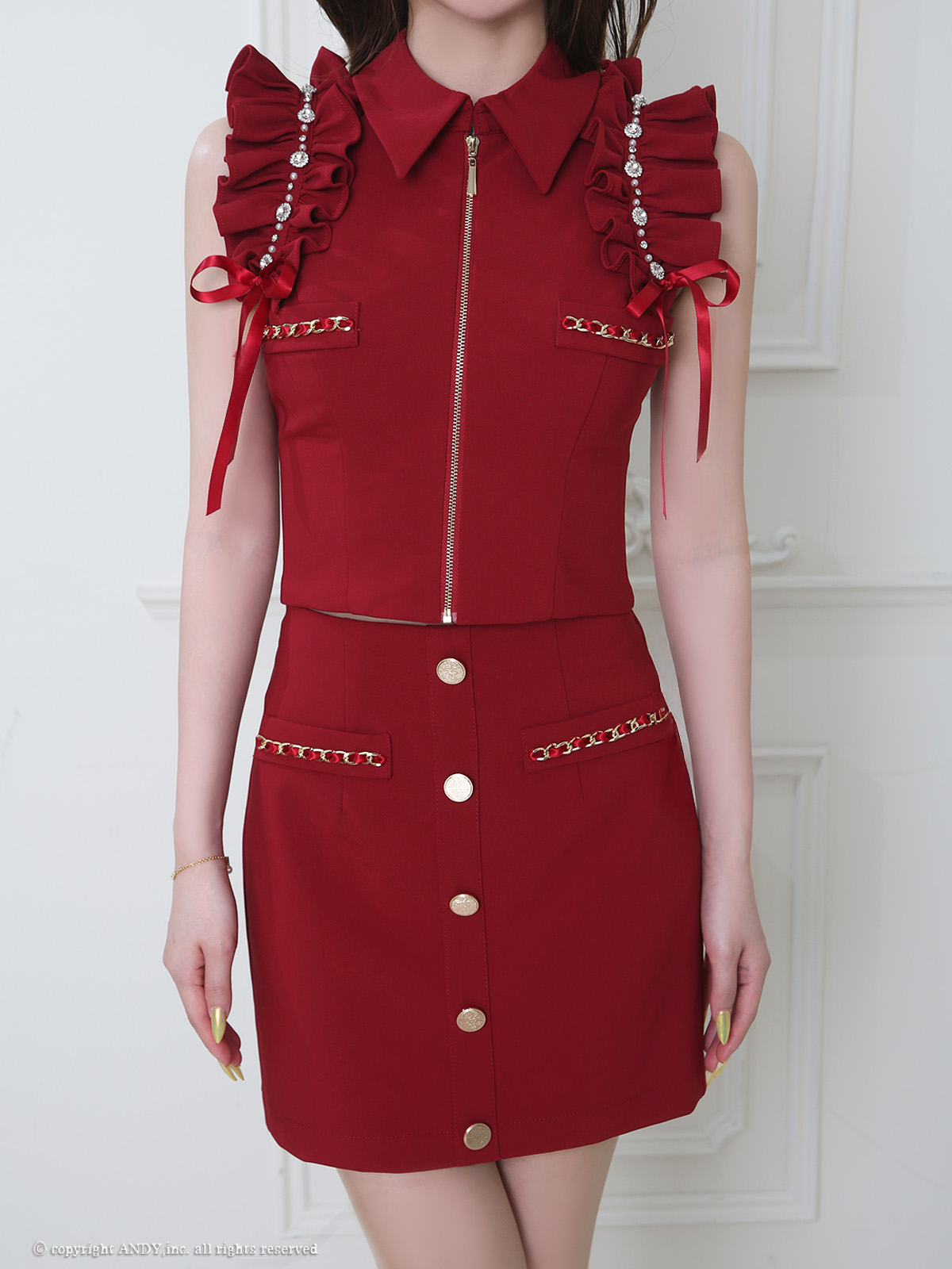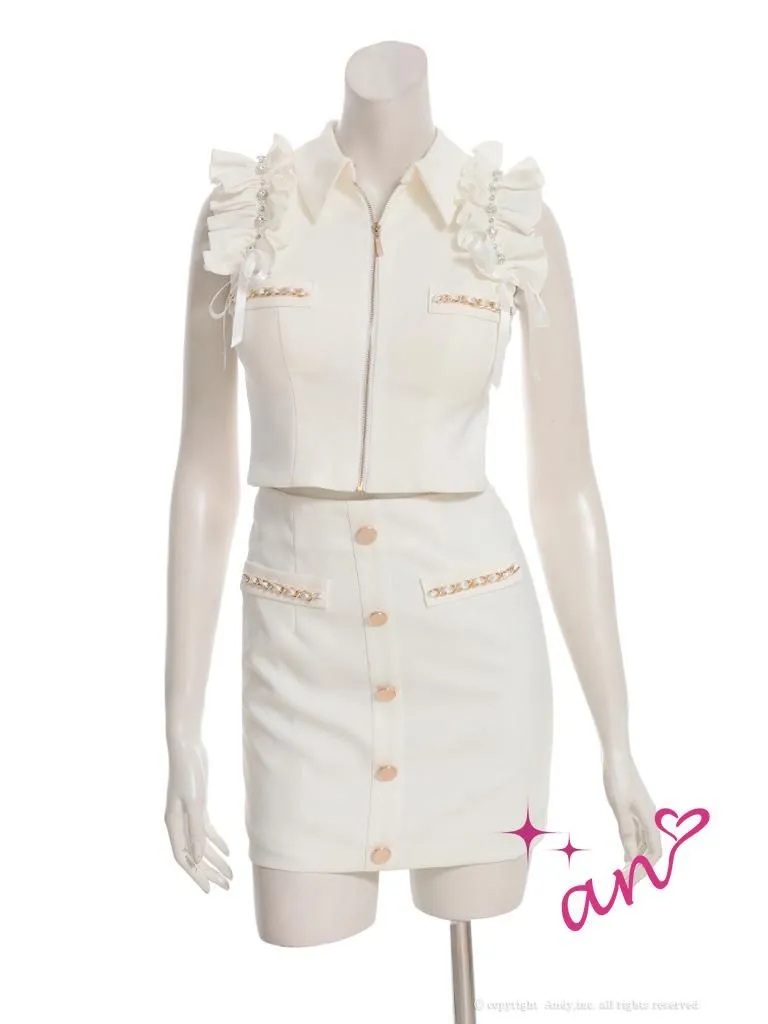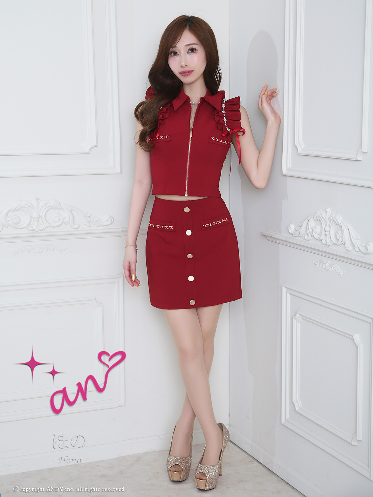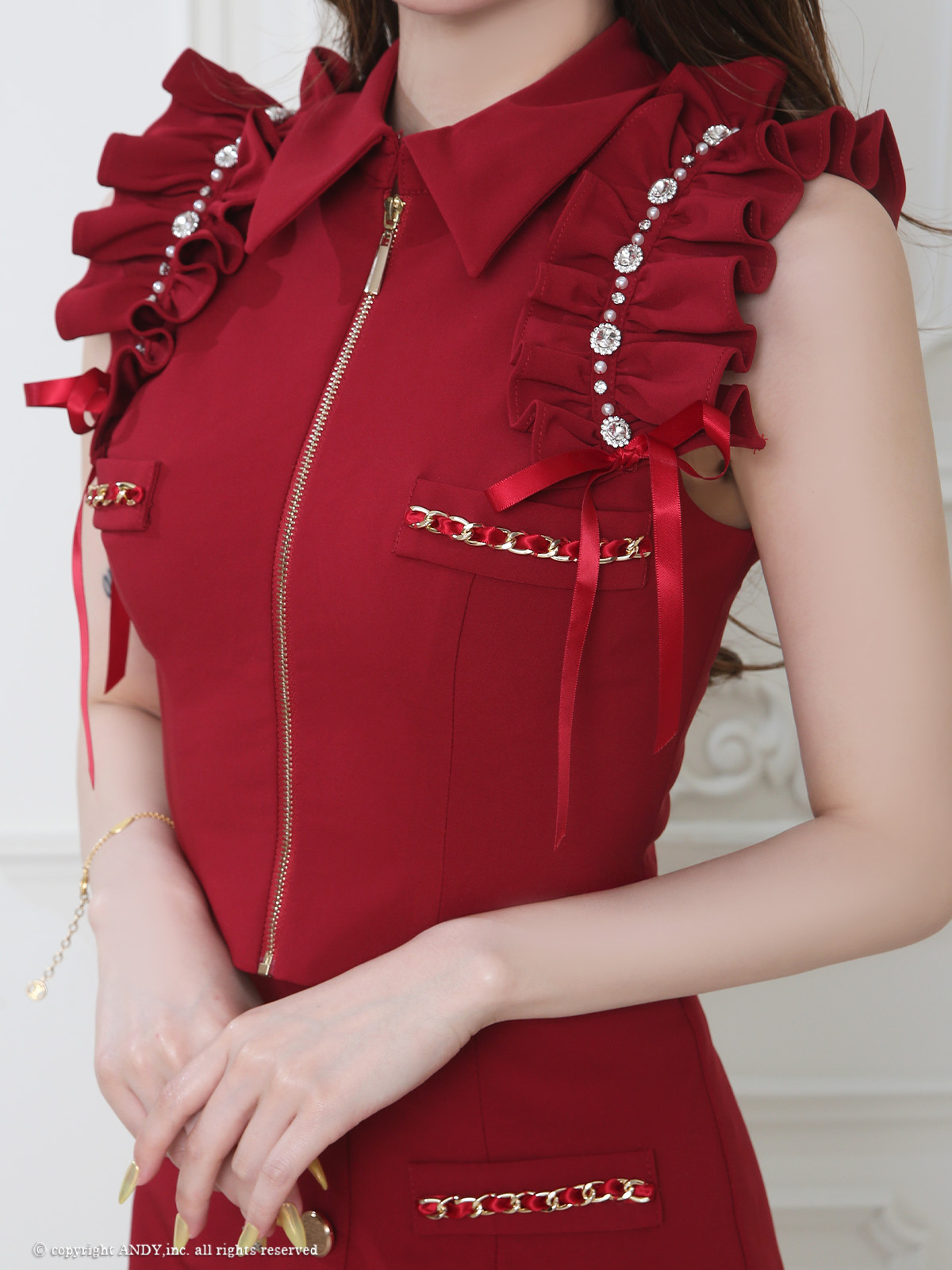 XSサイズあり【an /アン】襟付き/ ビジュー/ フロントジップ/ ノースリーブ/ フリル/ リボン/タイト/ セットアップ/ ツーピース/ ミニドレス/ キャバドレス[OF05] [AOC3974-W-2509]