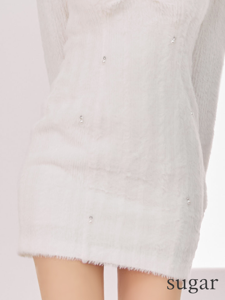 XSサイズあり【ROBE de FLEURS/ローブドフルール】フェザーニット/ パール付き/ ロングスリーブ/ タイト/ ミニドレス/ キャバドレス[OF08]