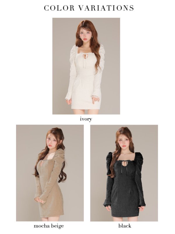 ストーン付きベロア、袖口にはスカラップレースを使用し、胸元のリボンデザインが上品なアクセント。