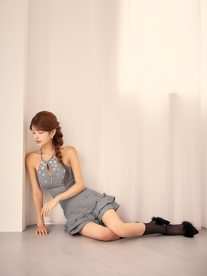 - > XSサイズあり【ROBE de FLEURS/ローブドフルール】ホルターネック/ バストジップ/ ビジュー/ フレア/ ツーピース/ セットアップ/ ミニドレス/ キャバドレス[OF08]