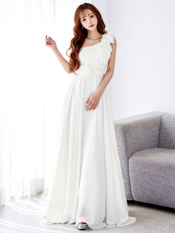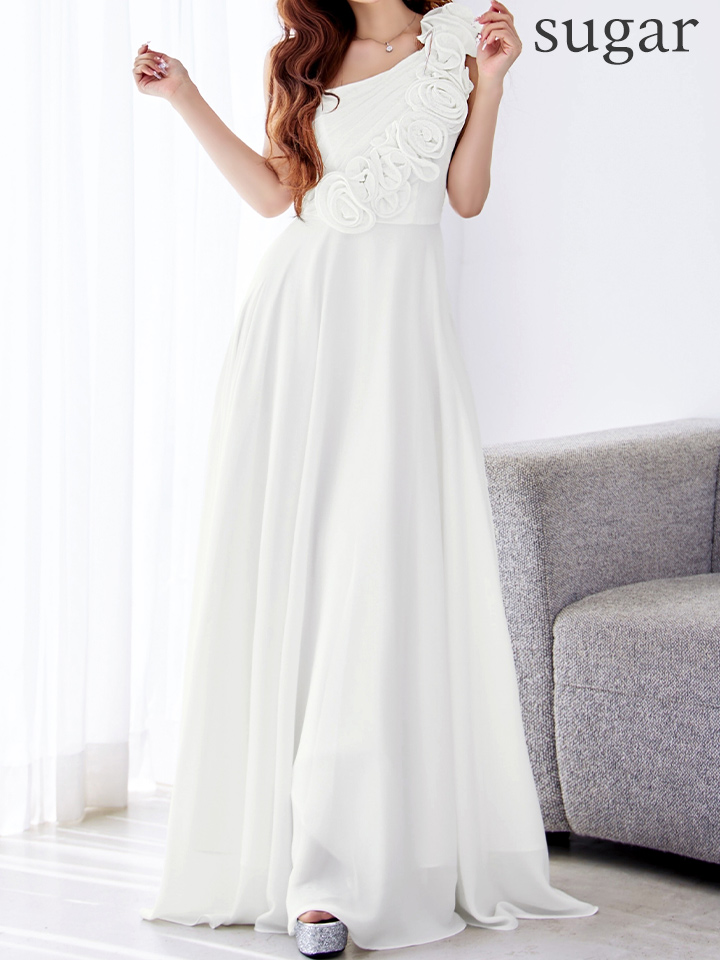 Lサイズあり【CLEO CLOE/ クレオ クロエ】パーティードレス/ ステージドレス/ イベントドレス/ 立体フラワーフリル/ アシメショルダー/ ノースリーブ/ Aライン/ フレア/ ロングドレス long[OF05]