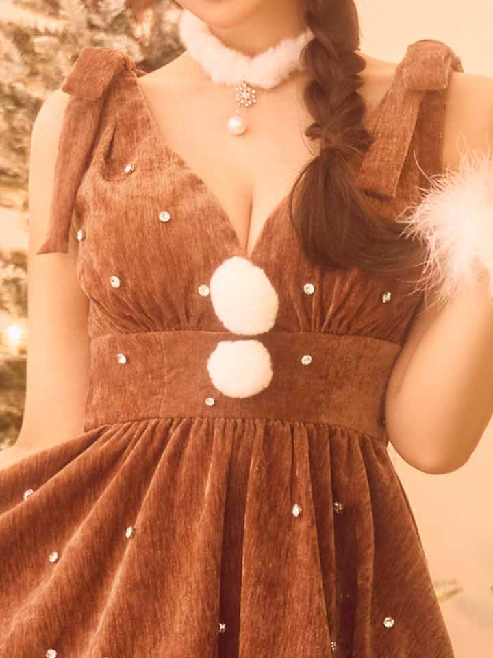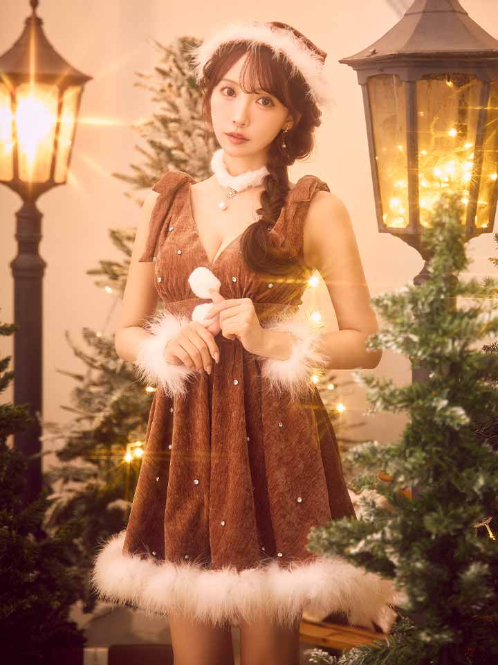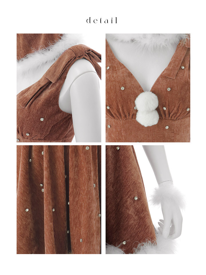ブラウン クリスマス ブラウンビジュー ベロア ドレス ファー付きワンピース キャバドレスクリスマス イベントドレス