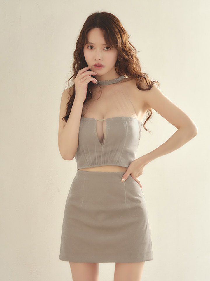 - > XSサイズあり【Glossy/グロッシー】ホルターネック/ ラメニット/ セットアップ/ バックリボン/ シアー/ タイト/ ミニドレス/ キャバドレス[OF08]
