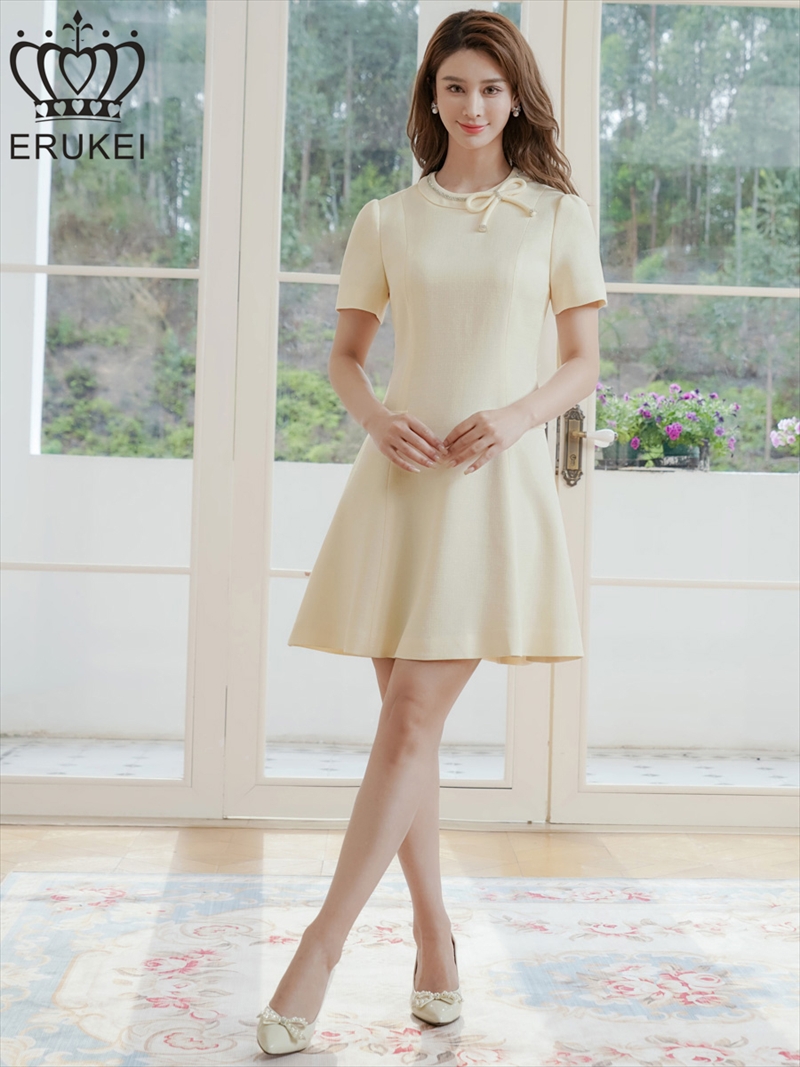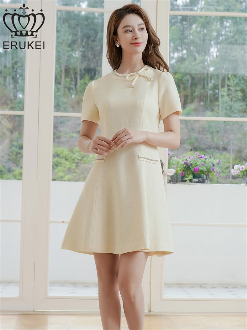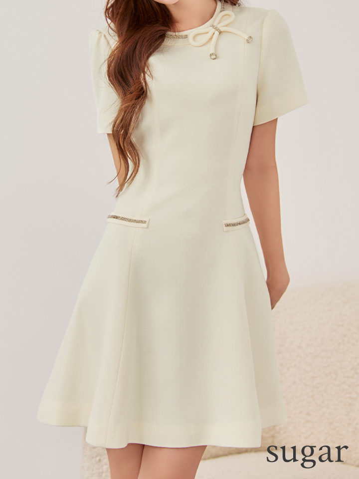 XS-Lサイズあり 【GINZA COUTURE/銀座クチュール】ネックリボン/ 半袖/ 袖あり/ ラインストーン/ フェイクポケット/ フレア/ Aライン/ ワンピース/ ミニドレス/ キャバドレス[OF2] [LKC37301-IV-S251006]