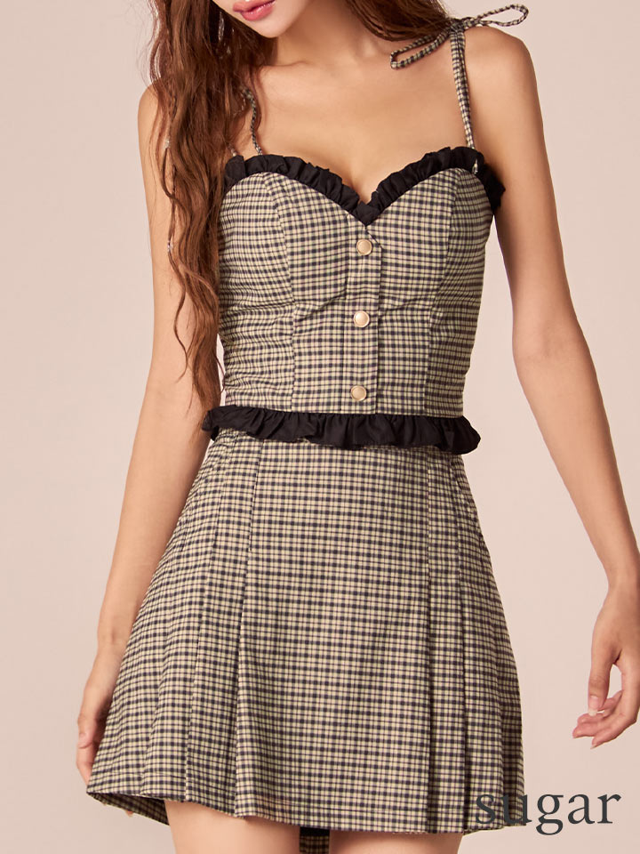 - > XSサイズあり【ANGEL R/エンジェルアール】ベアトップ/ 2way/ フリル/ チェック/ フロントボタン/ プリーツ/ フレア/ マイクロミニドレス/ キャバドレス[OF2]