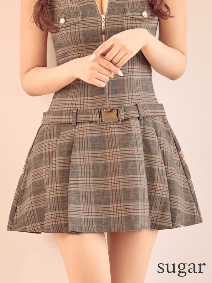 - > XSサイズあり【DEA./ディア】Vカット/ ジップ/ チェック柄/ フレア/ ミニドレス/ キャバドレス[OF08]