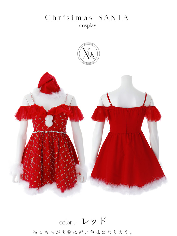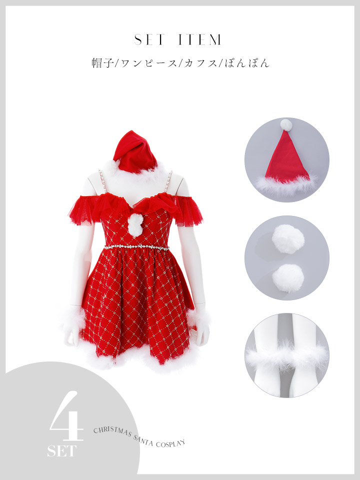 - > 【即日発送】【サンタ】ビジュー格子柄オフショルサンタコスプレ【コスプレ4点セット】【XS-Lサイズ/1カラー】[HC03]