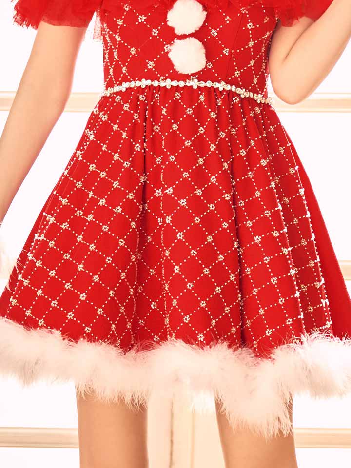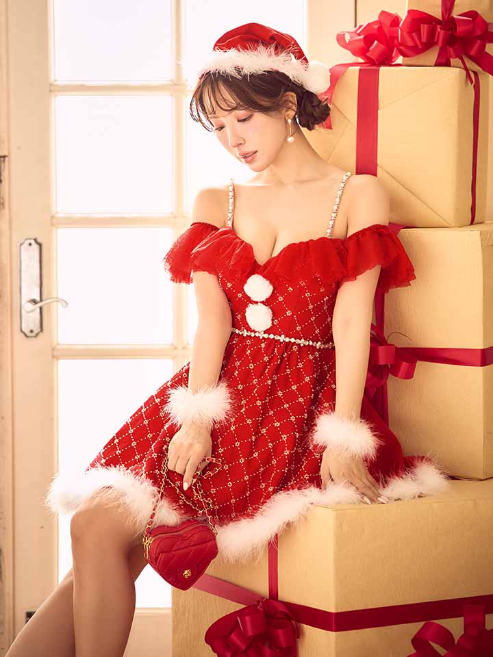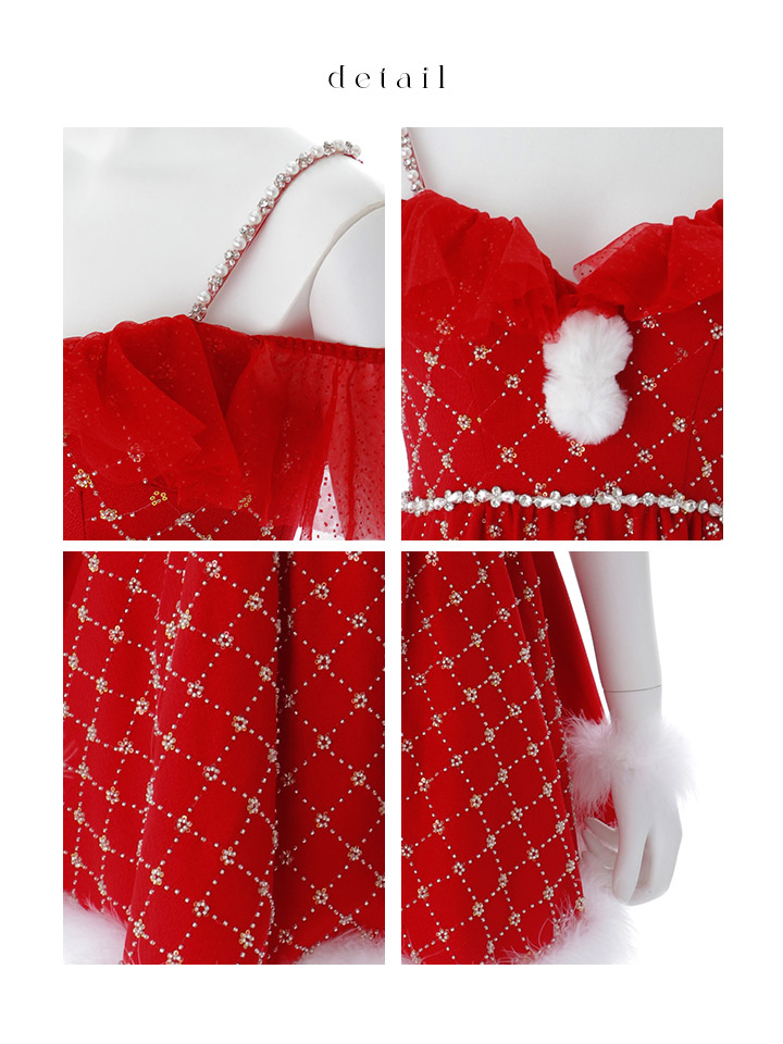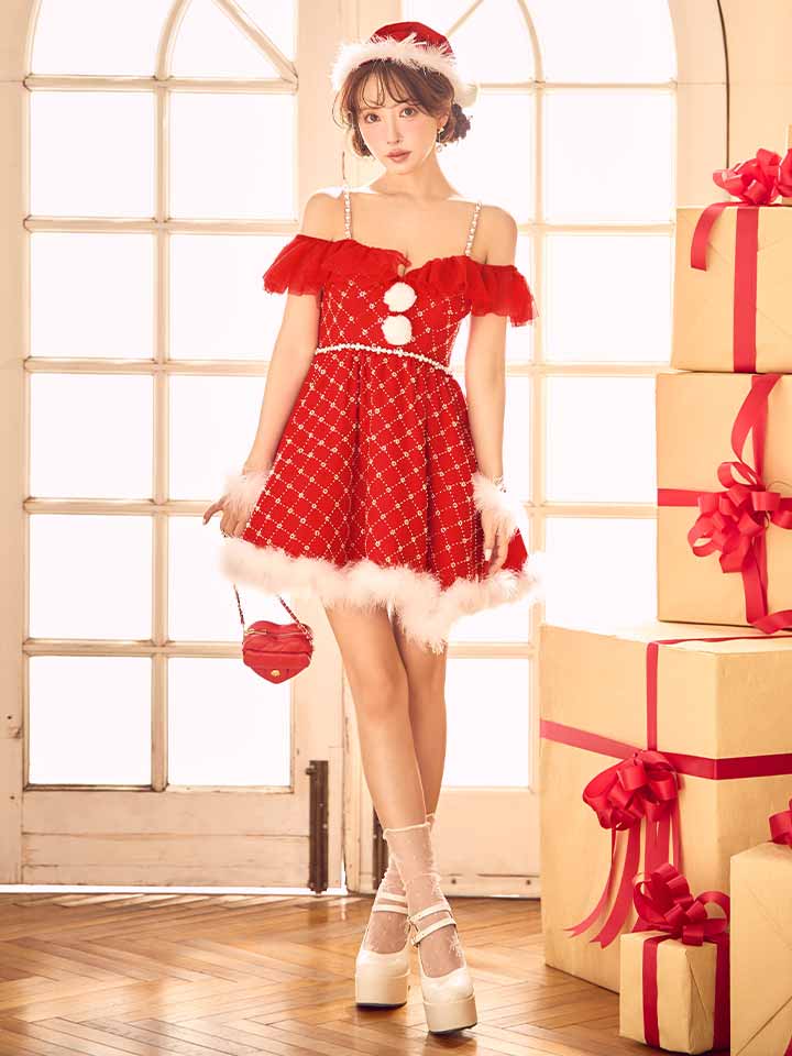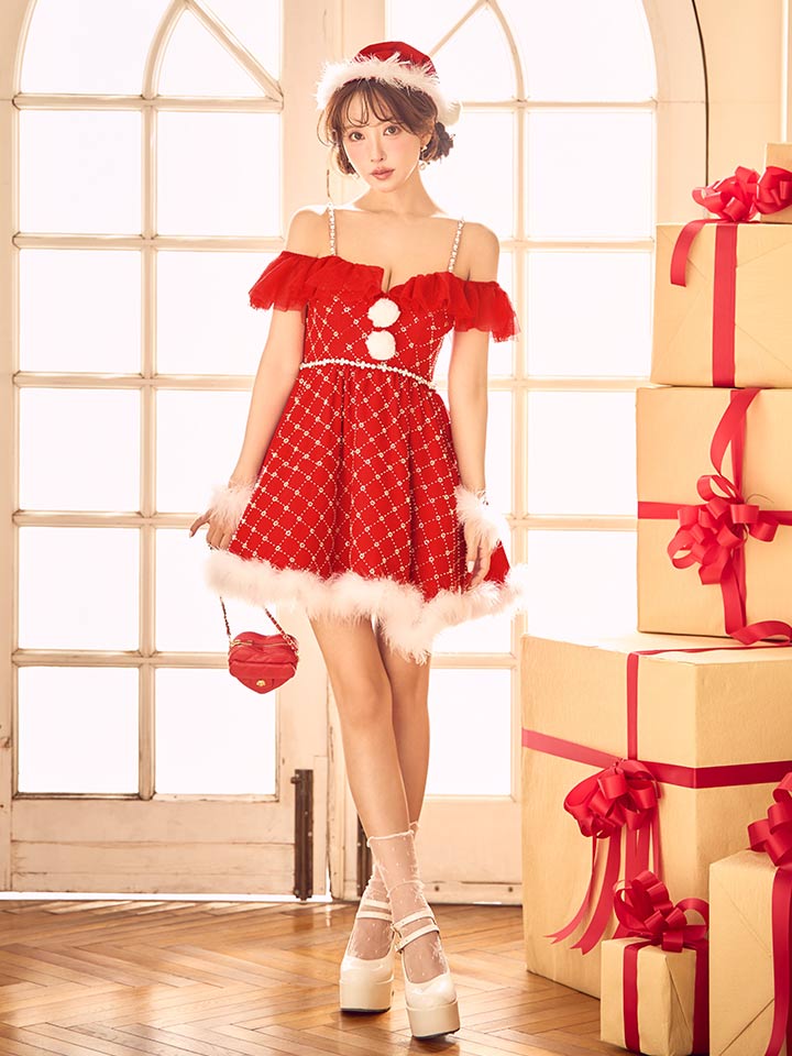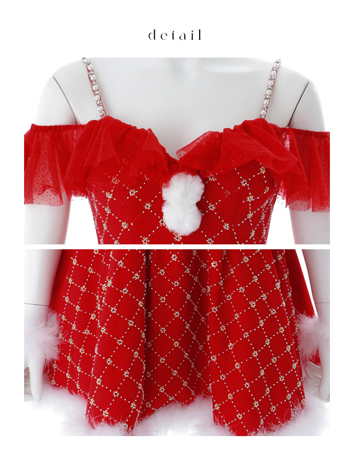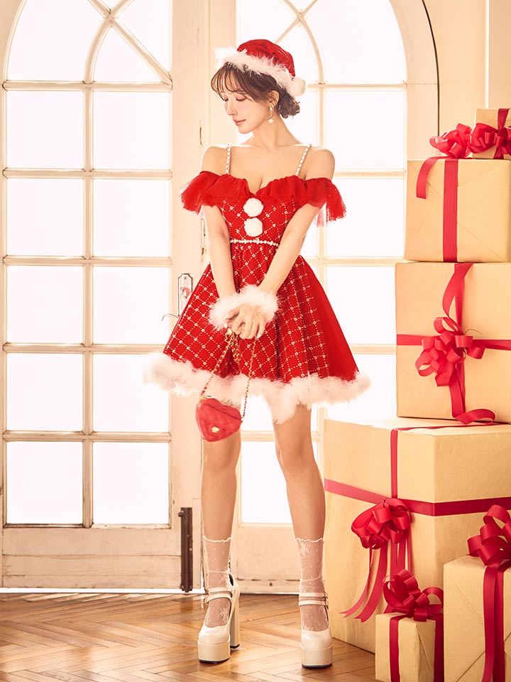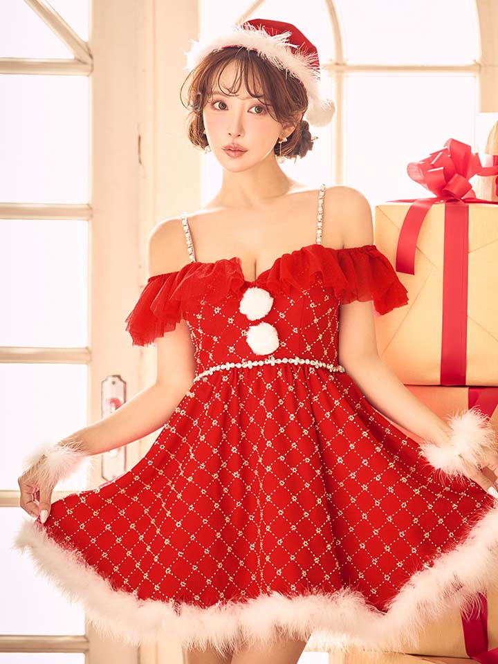 【即日発送】【サンタ】ビジュー格子柄オフショルサンタコスプレ【コスプレ4点セット】【XS-Lサイズ/1カラー】[HC03] [SS-158-YN-dzw-R-25MY]