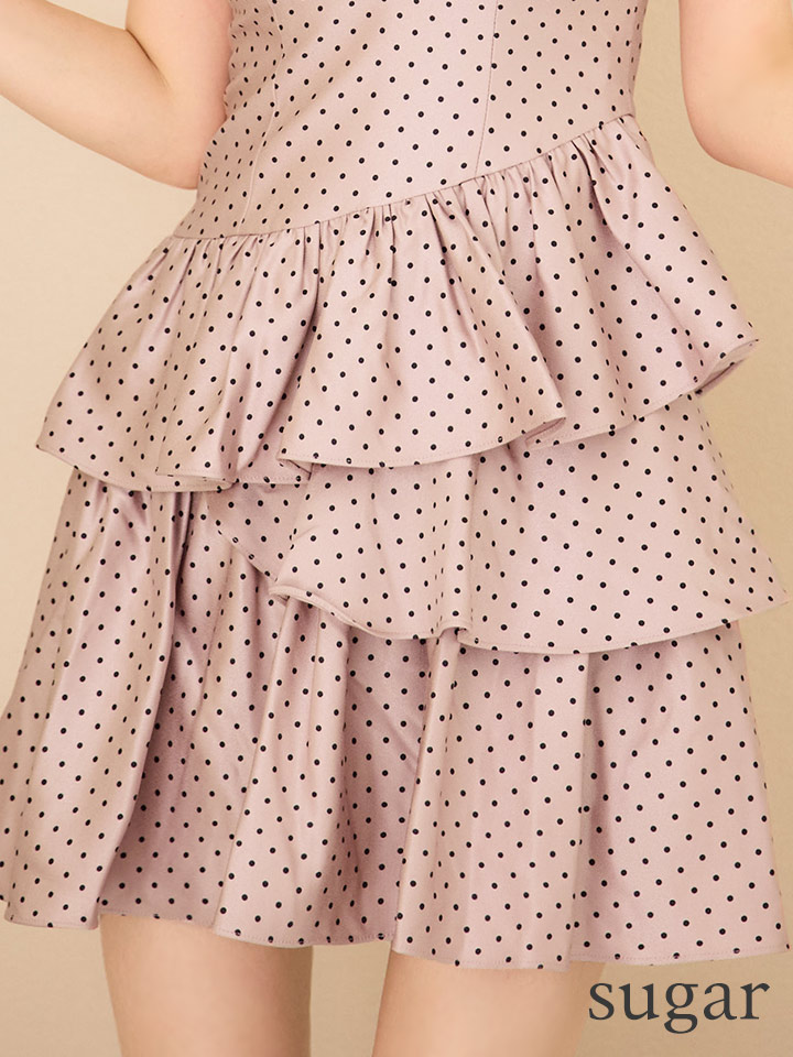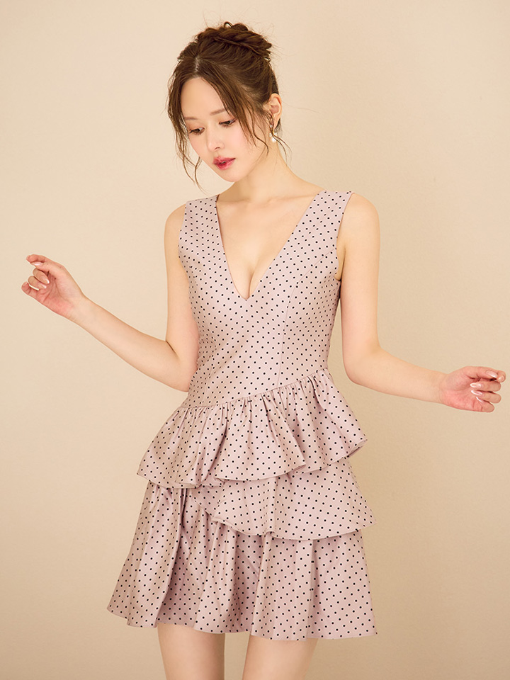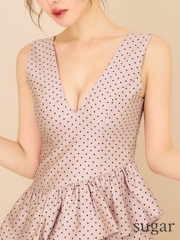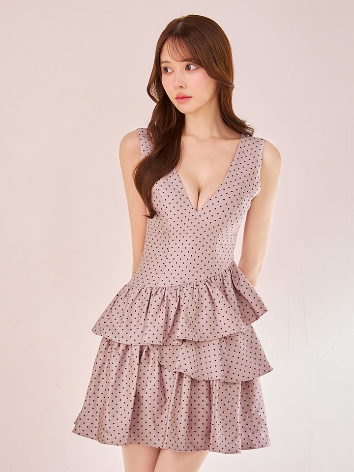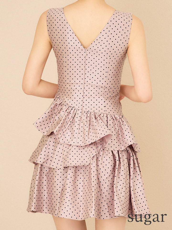 XS-Lサイズあり【ERUKEI エルケイ】ドットプリント/ ノースリーブ/ Vネック/ アシンメトリー/ 変形ティアード/ フレア/ Aライン/ ワンピース/ ミニドレス/ キャバドレス[OF2] [LKE25193-P-S2510]