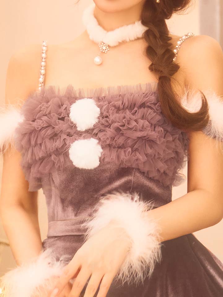 ベルベット素材のフレアスカートが上品な光沢をプラスします。