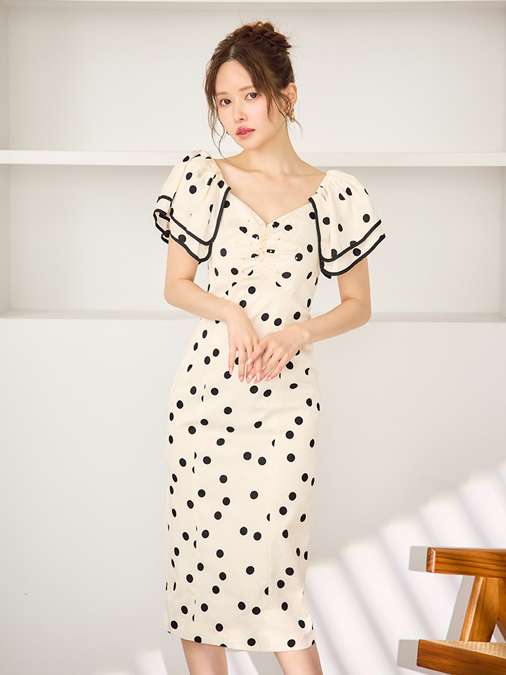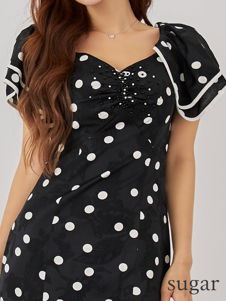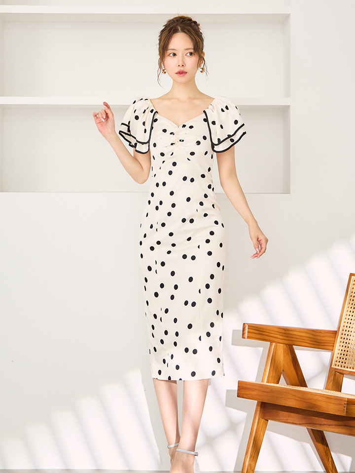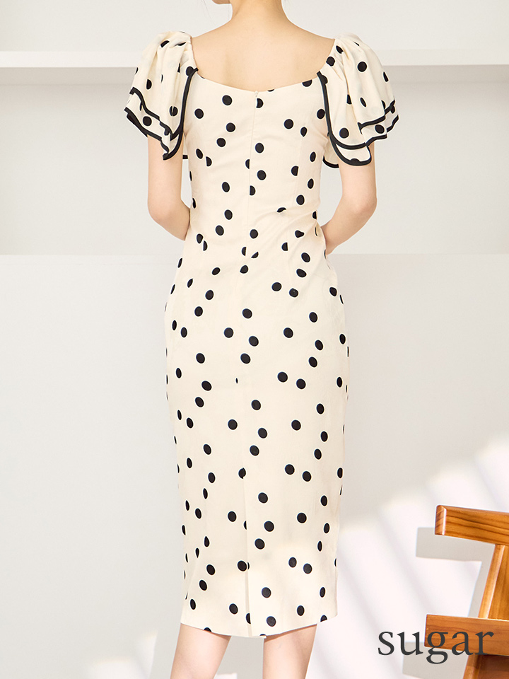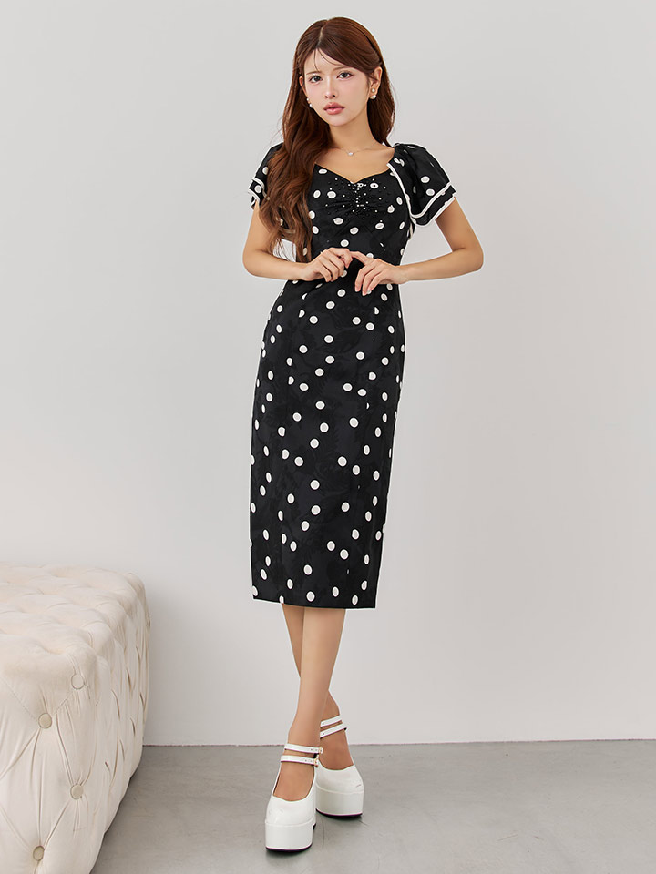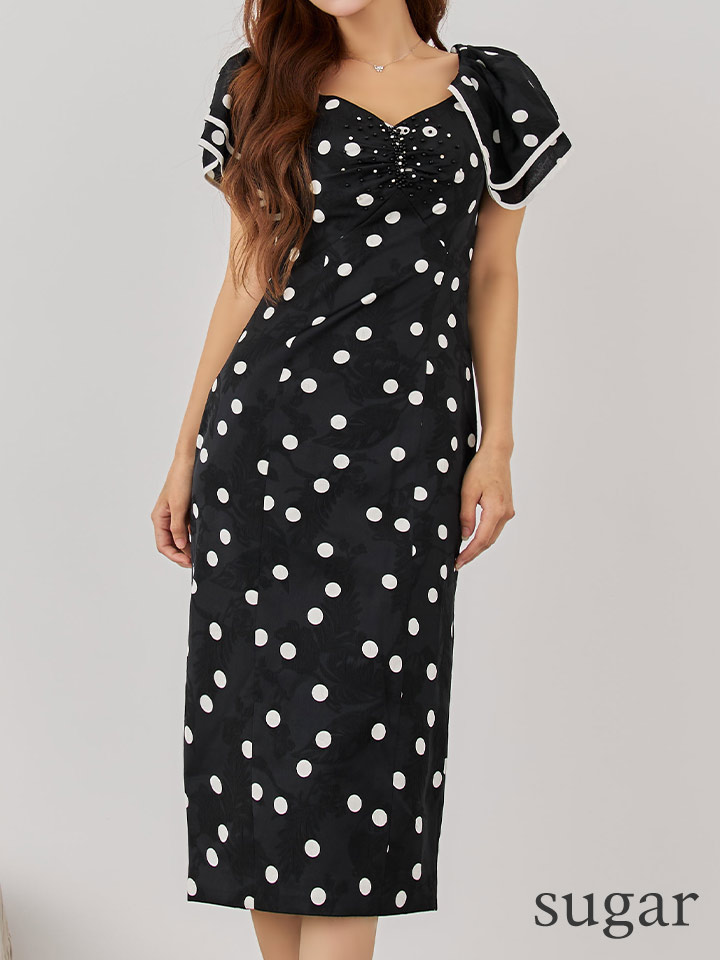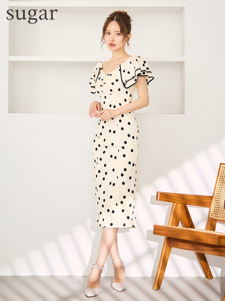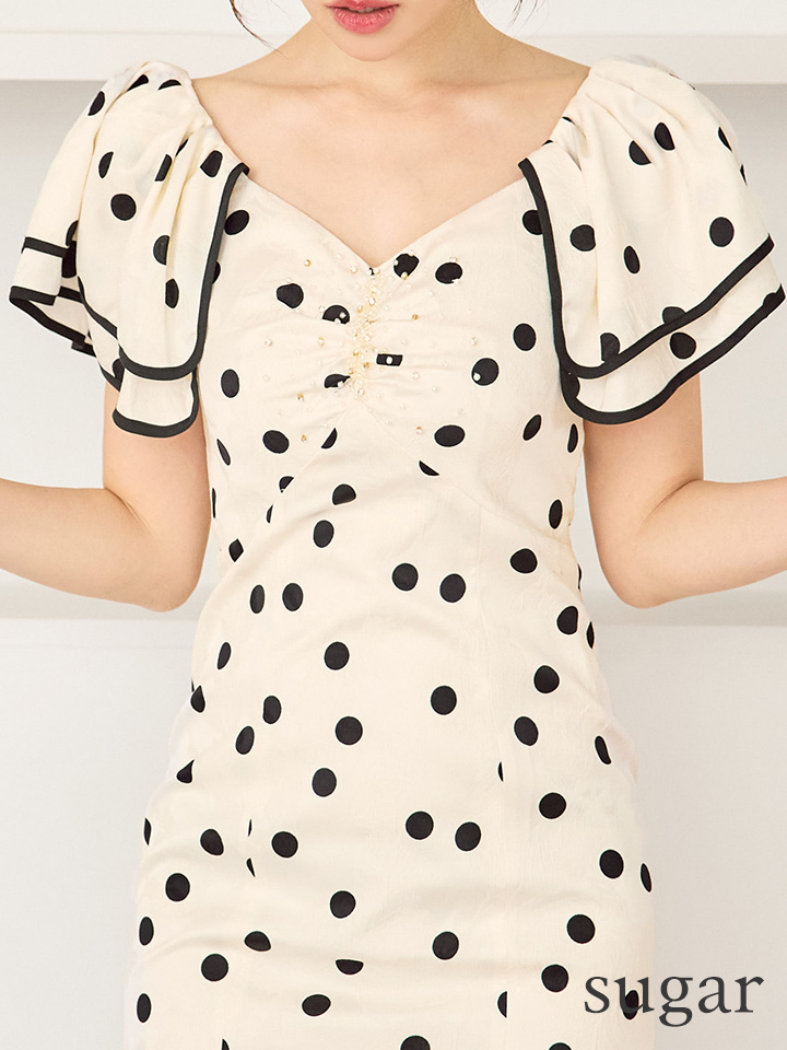 - > XS-Lサイズあり【GINZA COUTURE/銀座クチュール】サテン/ ジャガード/ ドットプリント/ フリルスリーブ/ パイピング/ ラインストーン/ タイト/ 膝丈/ ミディアムドレス/ キャバドレス[OF2]