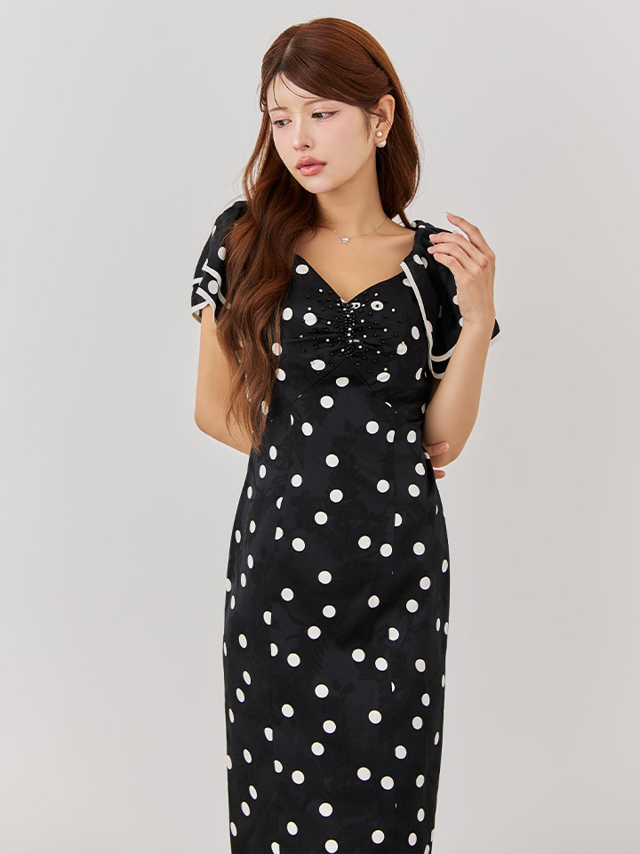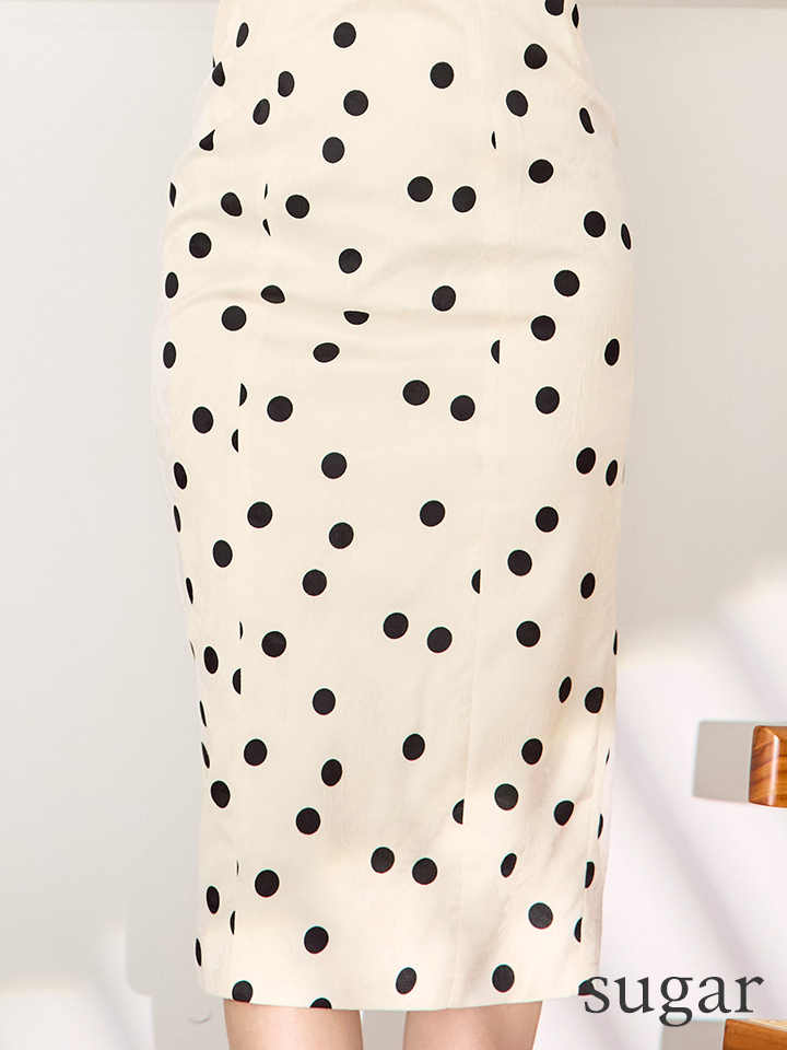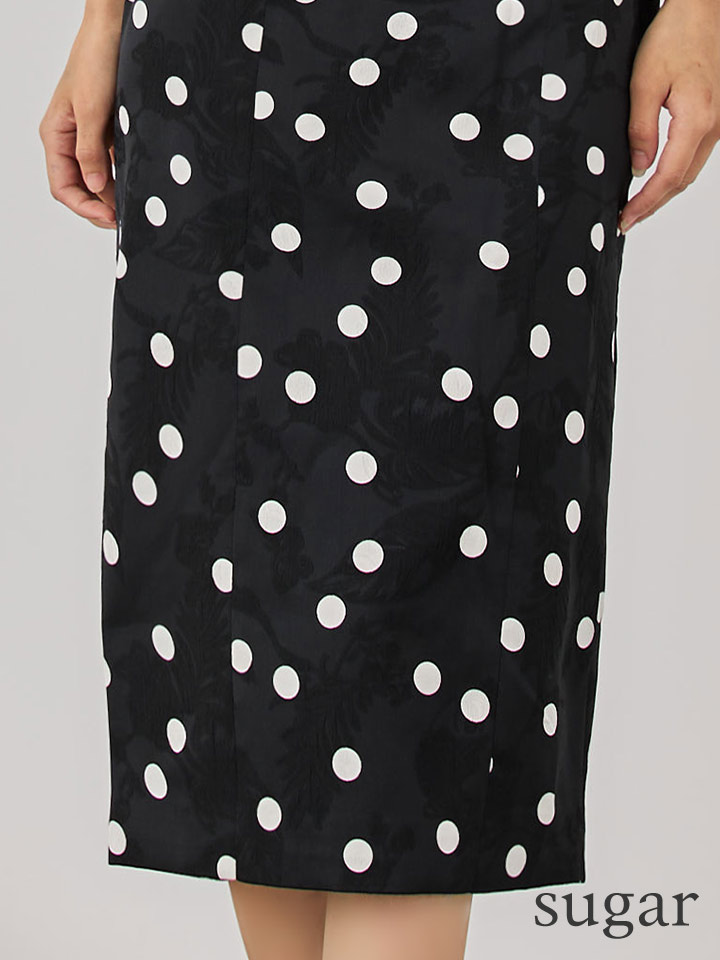 織り込まれた花柄のサテン生地にドットプリントがオシャレなミディアムドレス♡
