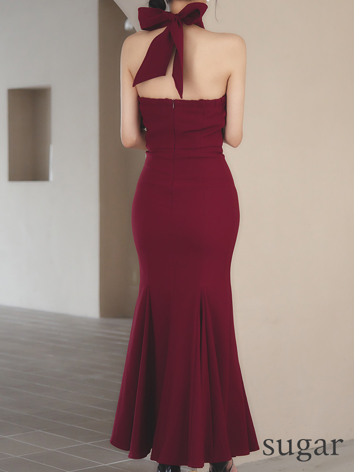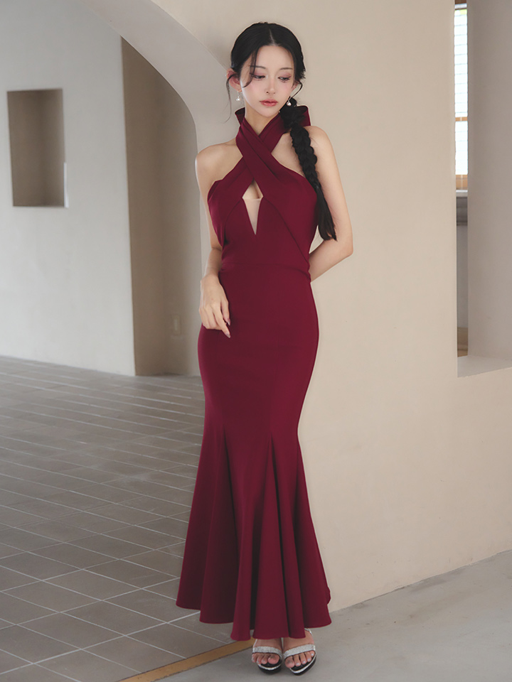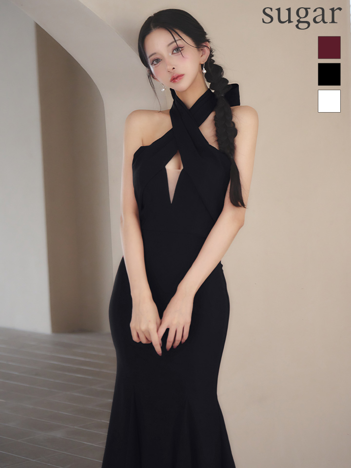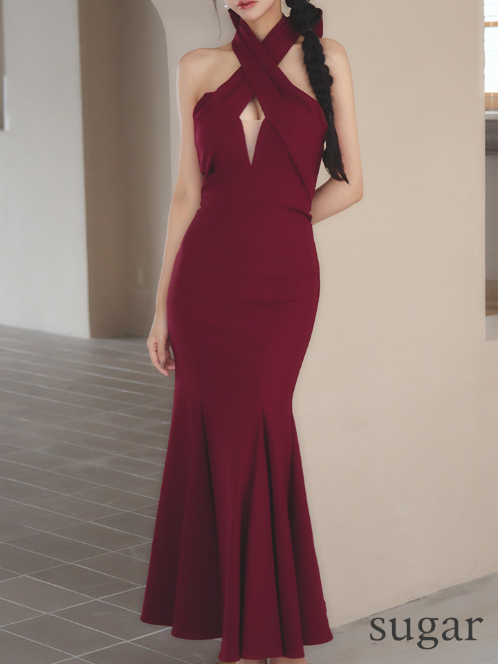 クロスホルターxバストシアーの組み合わせが大人の色気醸し出すストレッチロングドレス♡
