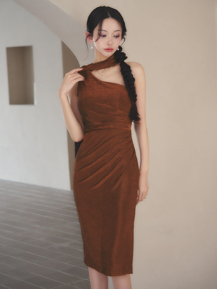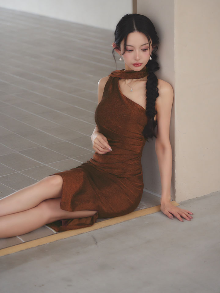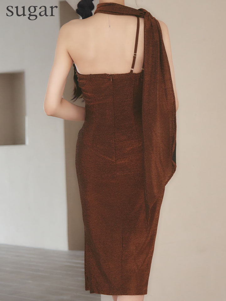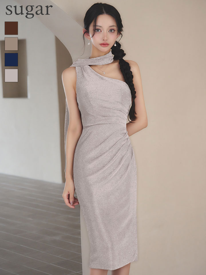 - > Lサイズあり【JEAN MACLEAN/ジャンマクレーン】ストール付き/ ワンショルダー/ ラメニット/ タック/ ひざ丈/ ストレッチ/ タイト/ ミディアムドレス/ キャバドレス[OF2A]【一部予約商品/10月下旬発送予定】