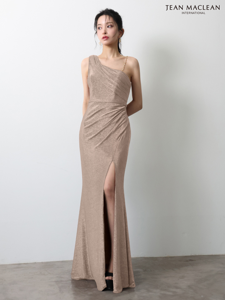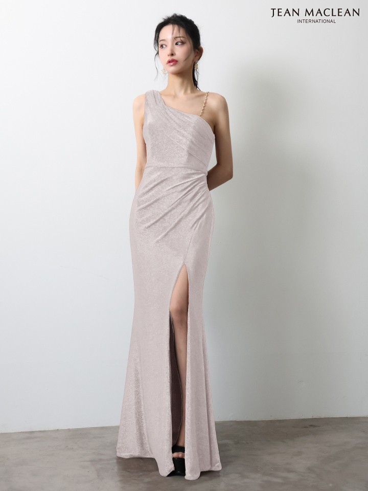 ワンショルダーと長めのスリットから覗く素肌が大人の色気を醸し出し、