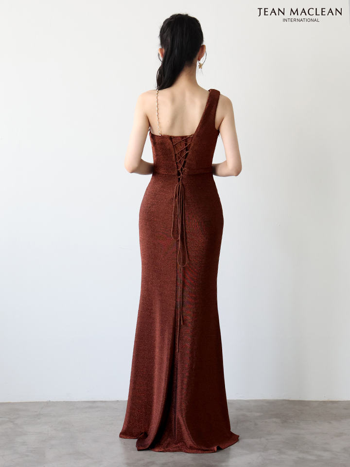 【予約商品/10月下旬発送予定】Lサイズあり【JEAN MACLEAN/ジャンマクレーン】チェーンストラップ/ ワンショルダー/ ラメニット/ タック/ スリット/ ストレッチ/ タイト/ ロングドレス/ キャバドレス long[OF2A]