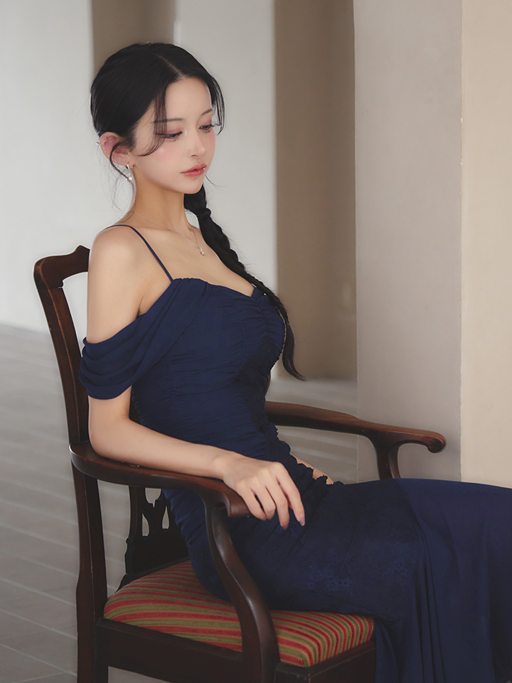 【ANDY/アンディ】 キャミ/ オフショル/ バストギャザー/ ジャガード/ アシンメトリー/ シアー/ マーメイド/ ミディアムドレス/ キャバドレス[OF05] [OK2987-NV-S251010]