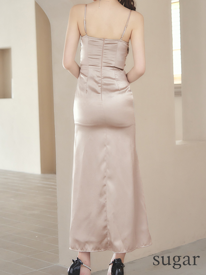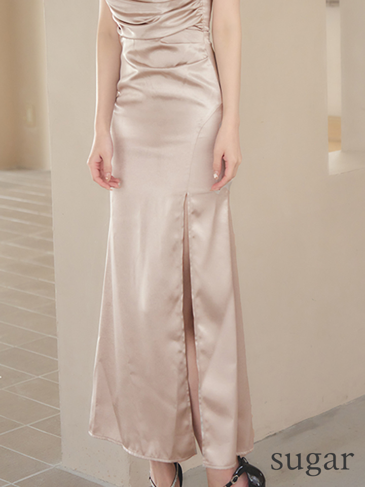 上品な光沢感のあるサテン地がラグジュアリーな雰囲気を纏うロングドレス。