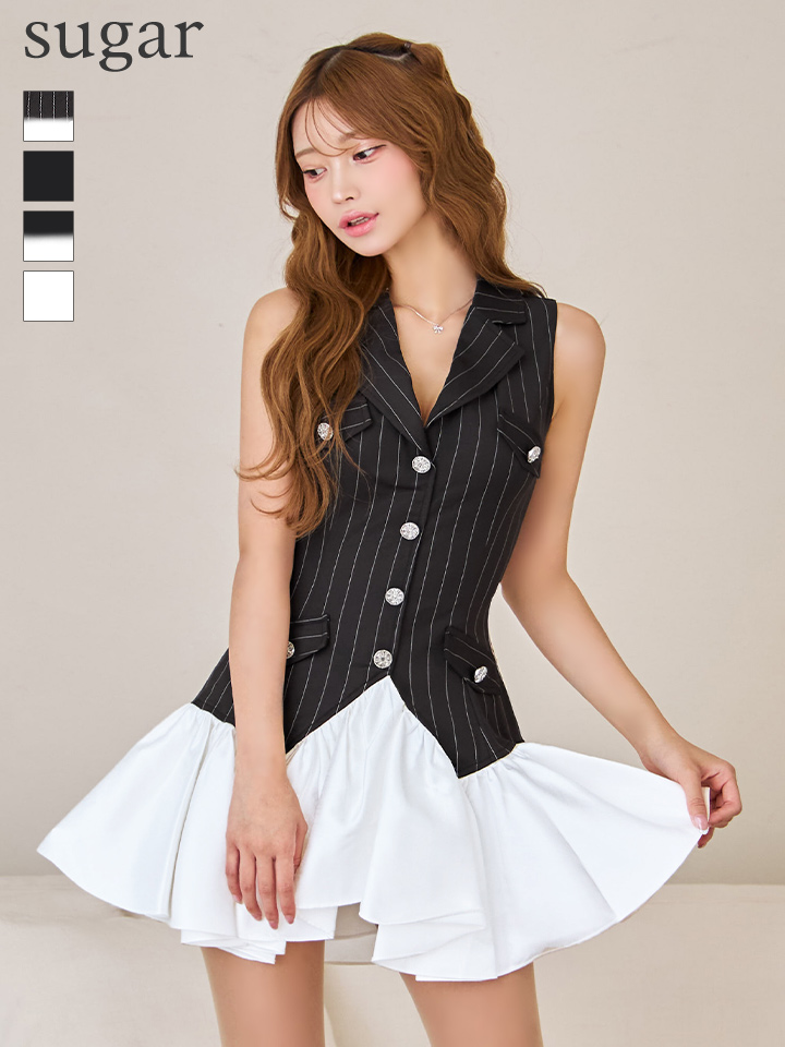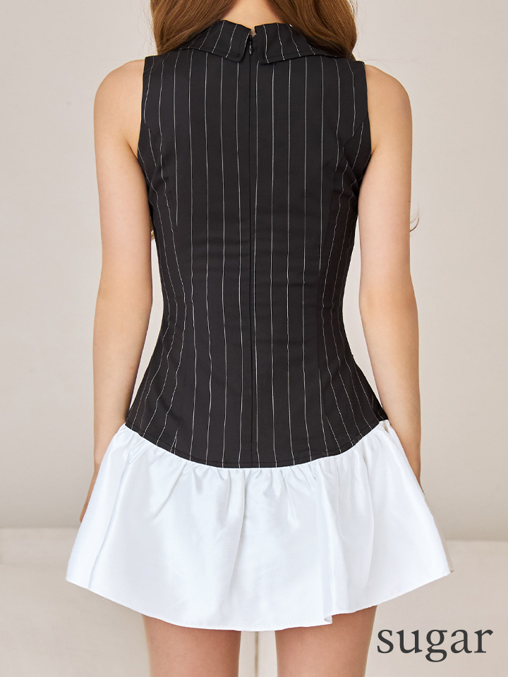 XSサイズあり【ANDY/アンディ】襟付き/ Vネック/ ボタン/ ノースリーブ/ バイカラー/ ストライプ/ フリル/ フレア/ ミニドレス/ キャバドレス[OF05] [OK2981-BxW-S251011]