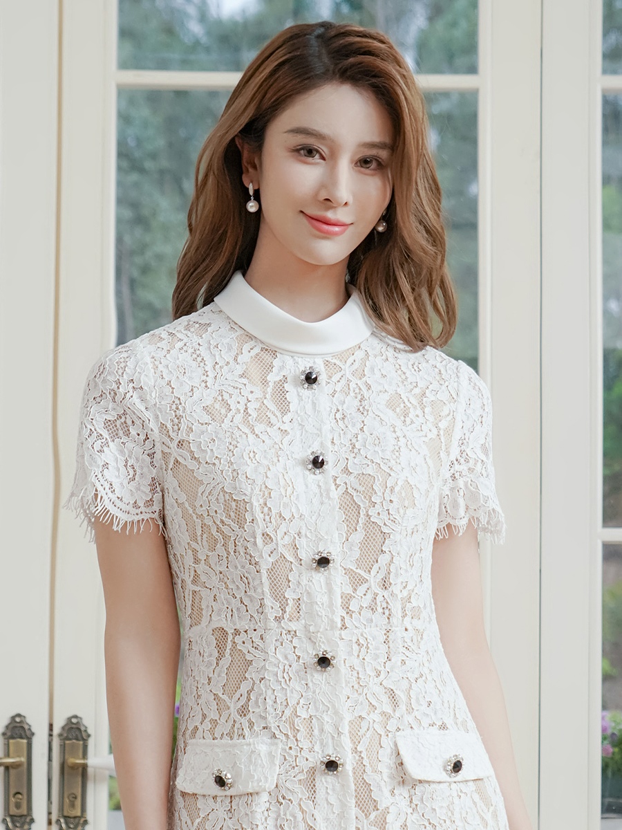 XS-Lサイズあり 【GINZA COUTURE/銀座クチュール】フラワーレース/ ハイネック/ 半袖/ 袖あり/ フェイクポケット/ タイト/ ミモレ丈/ ワンピース/ ミディアムドレス/ キャバドレス[OF2] [LKC25112-W-2510]