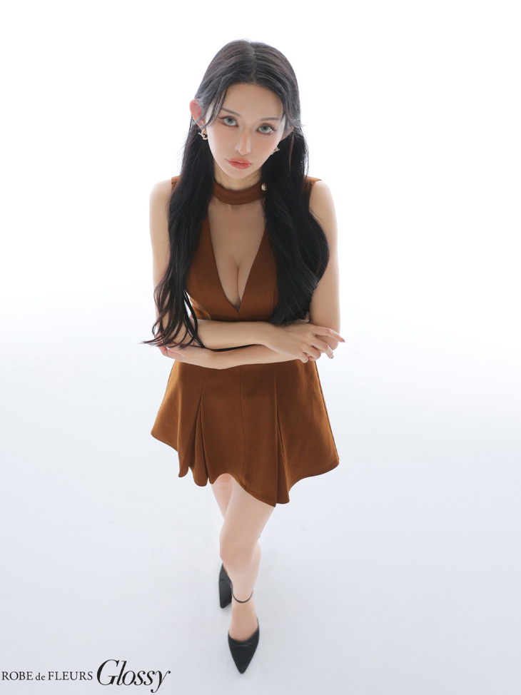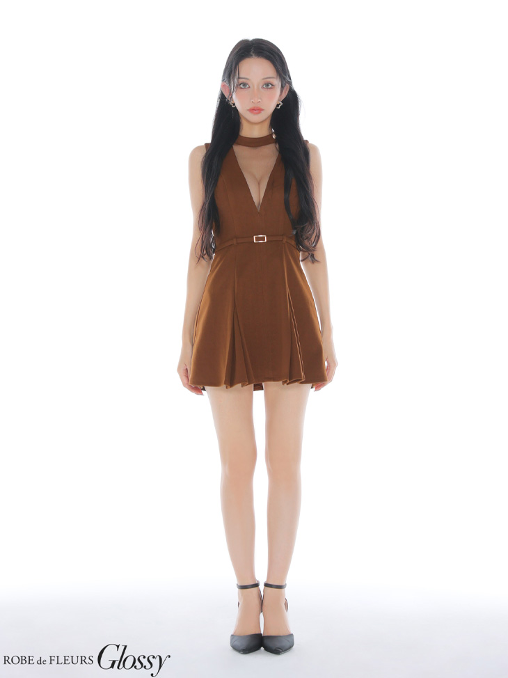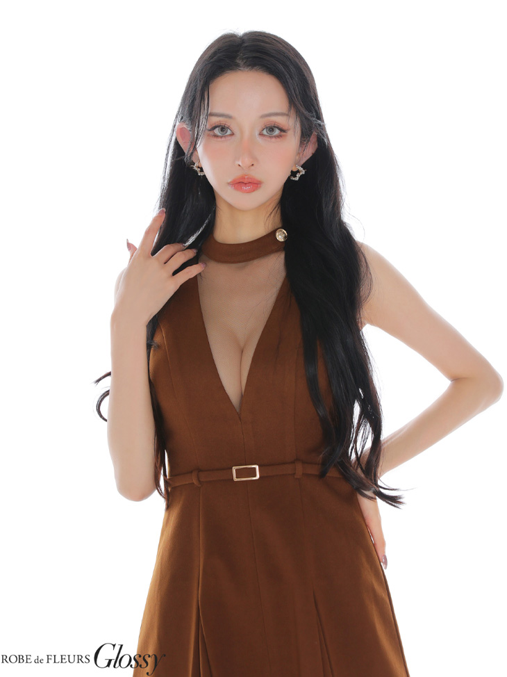 【予約商品/10月中旬発送予定】XSサイズあり【Glossy/グロッシー】チュール/ メルトン/ ホルター/ ベルト/ フレア/ ミニドレス/ キャバドレス[OF08] [GL3957-BR-S251014]