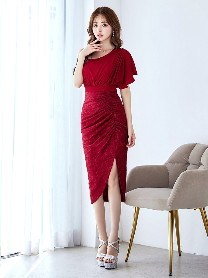 - > Lサイズあり【VANESSA HEART / ヴァネッサハート】【OF05】ワンショルダー/ シフォン/ 半袖/ 袖あり/ タック/ 切替/ タイト/ スリット/ ミディアムドレス/ キャバドレス