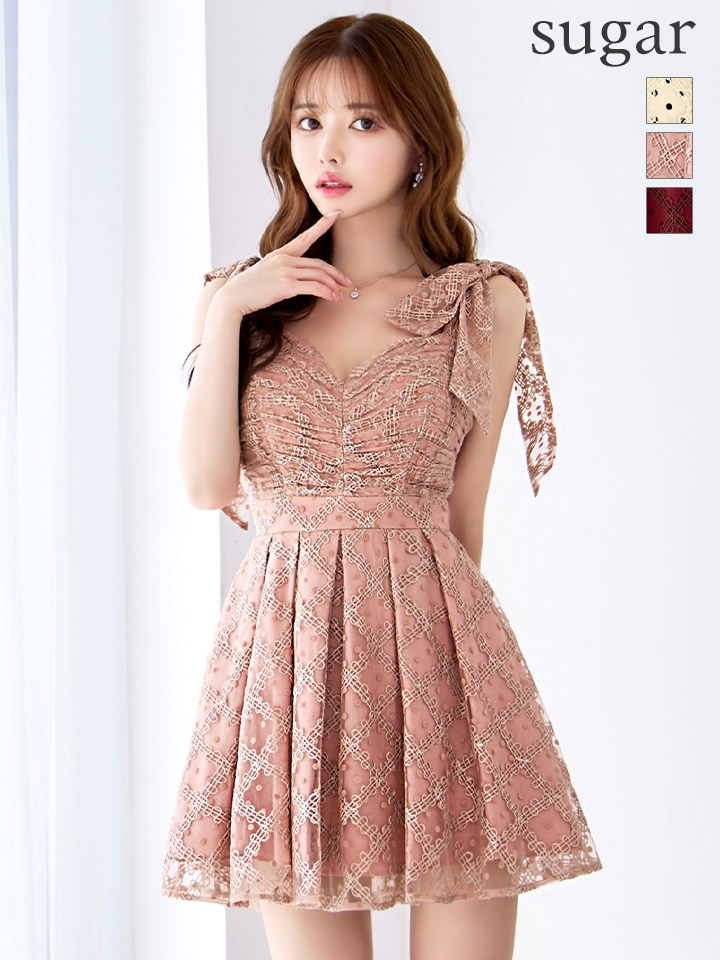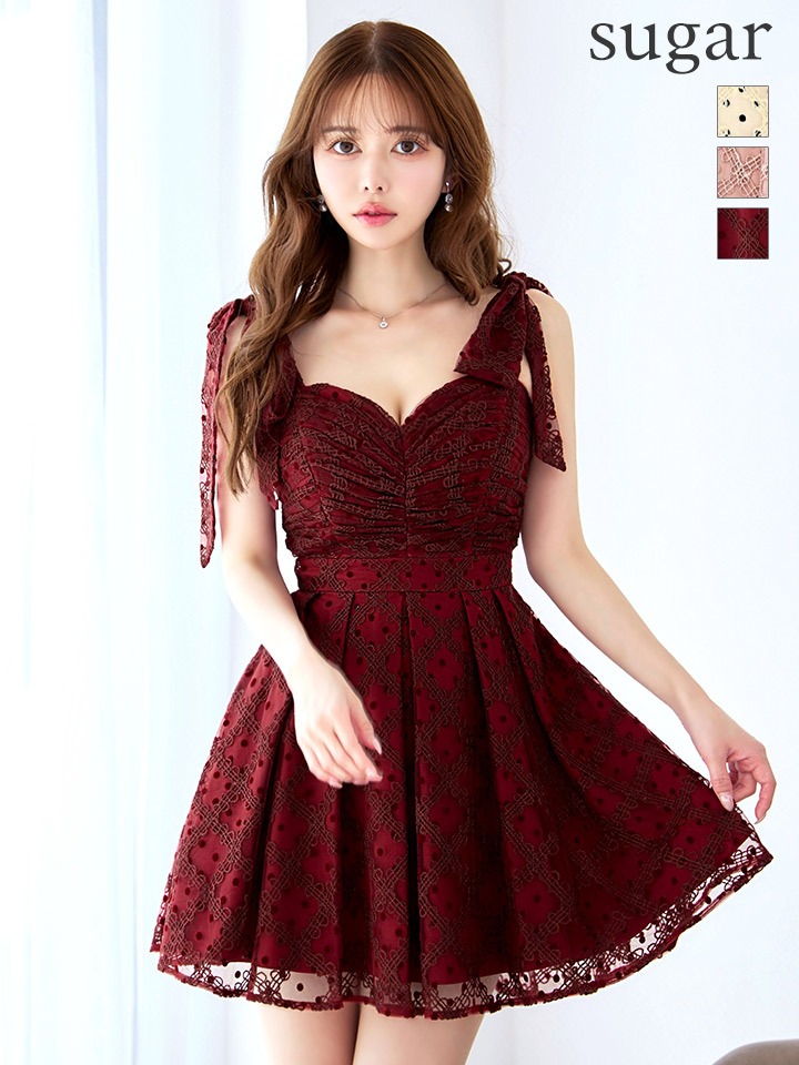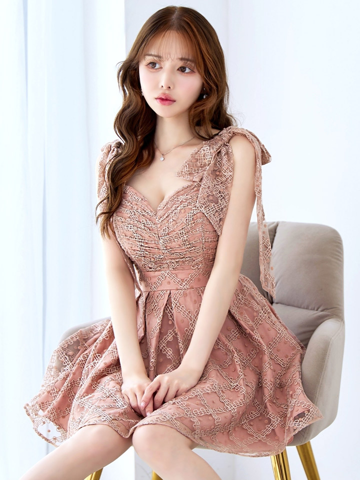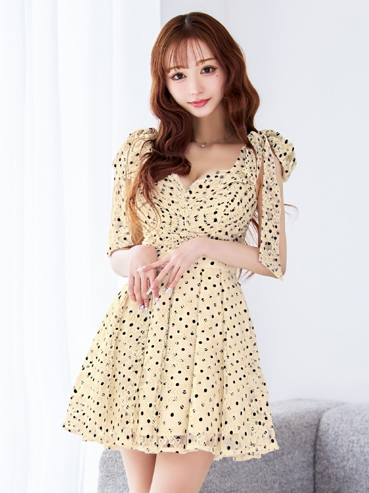 - > XS-Lサイズあり【Donia Quinn / ドニアクイーン】 ドット/ 刺繍レース/ ショルダーリボン/ ノースリーブ/ ハイウエスト/ フレア/ ワンピース/ ミニドレス/ キャバドレス[OF05]