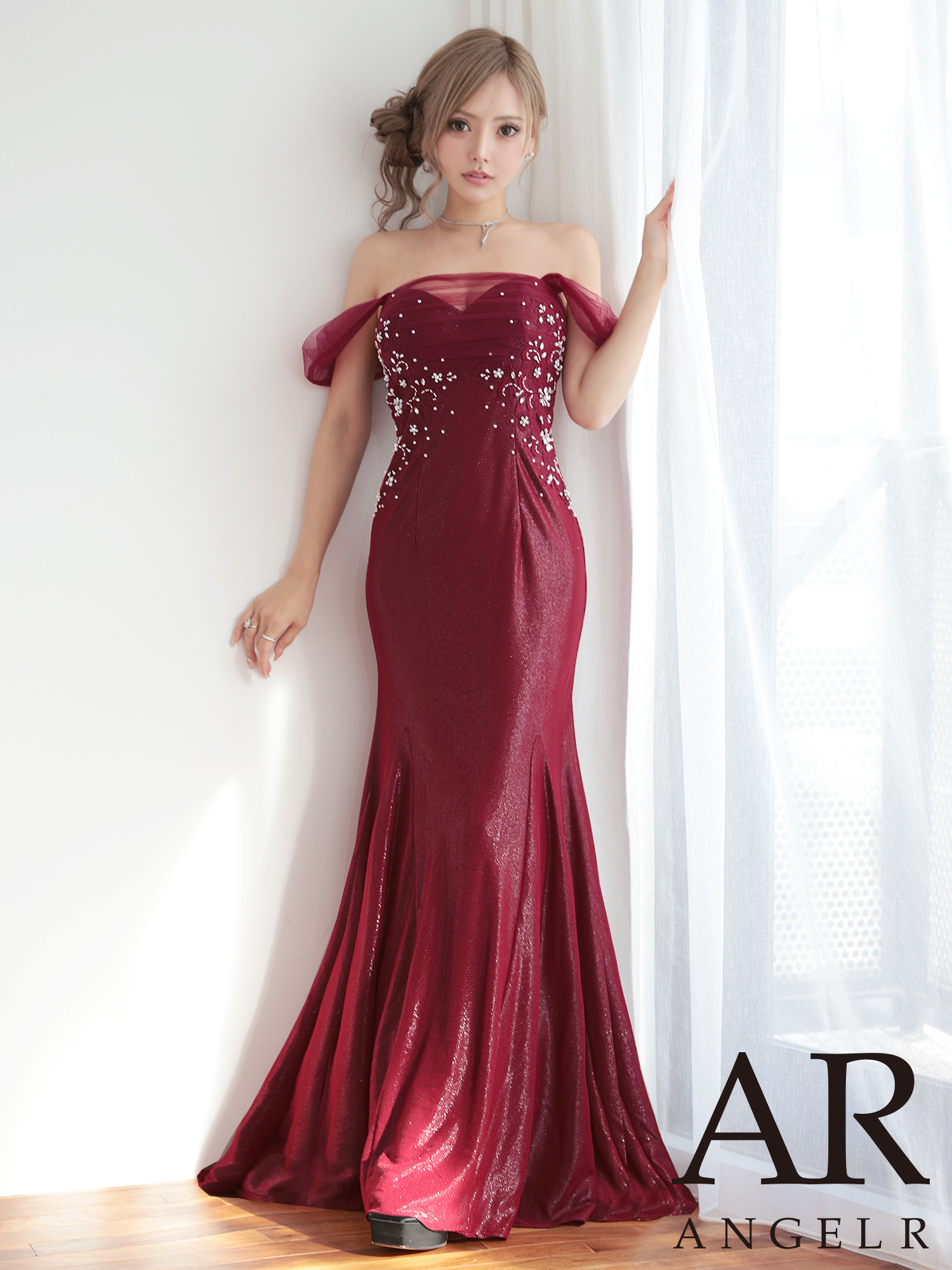 【予約商品/10月中旬-10月下旬発送予定】【ANGEL R/エンジェルアール】オフショルダー/ フラワー/ レース/ ビジュー/ ラメ/ タイト/ ロングドレス/ キャバドレス[OF2]