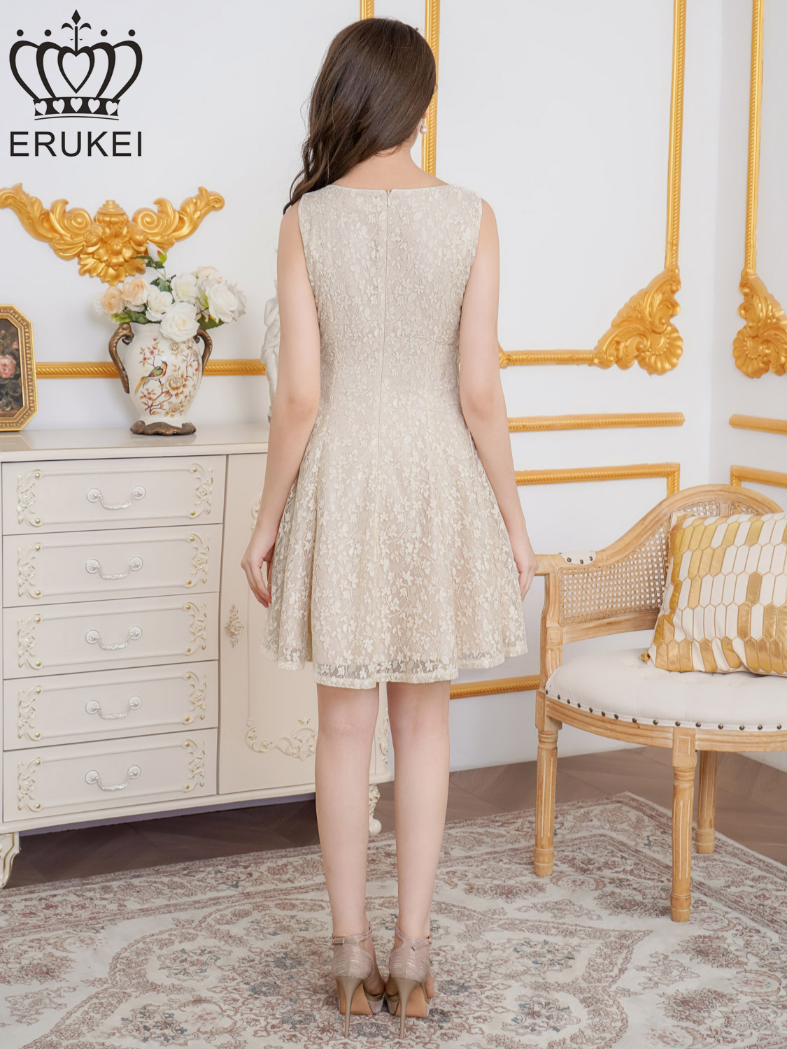 XS-Lサイズあり【ERUKEI エルケイ】フラワー刺繍/ 総レース/ レザー/ レースアップ/ ノースリーブ/ スクエアネック/ フレア/ Aライン/ ワンピース/ ミニドレス/ キャバドレス[OF2] [LKE25124-BE-2510]