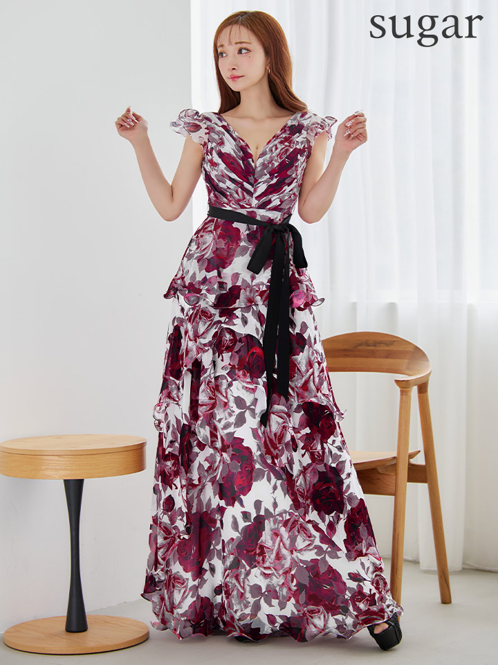 フラワープリントが華やかなAラインロングドレス