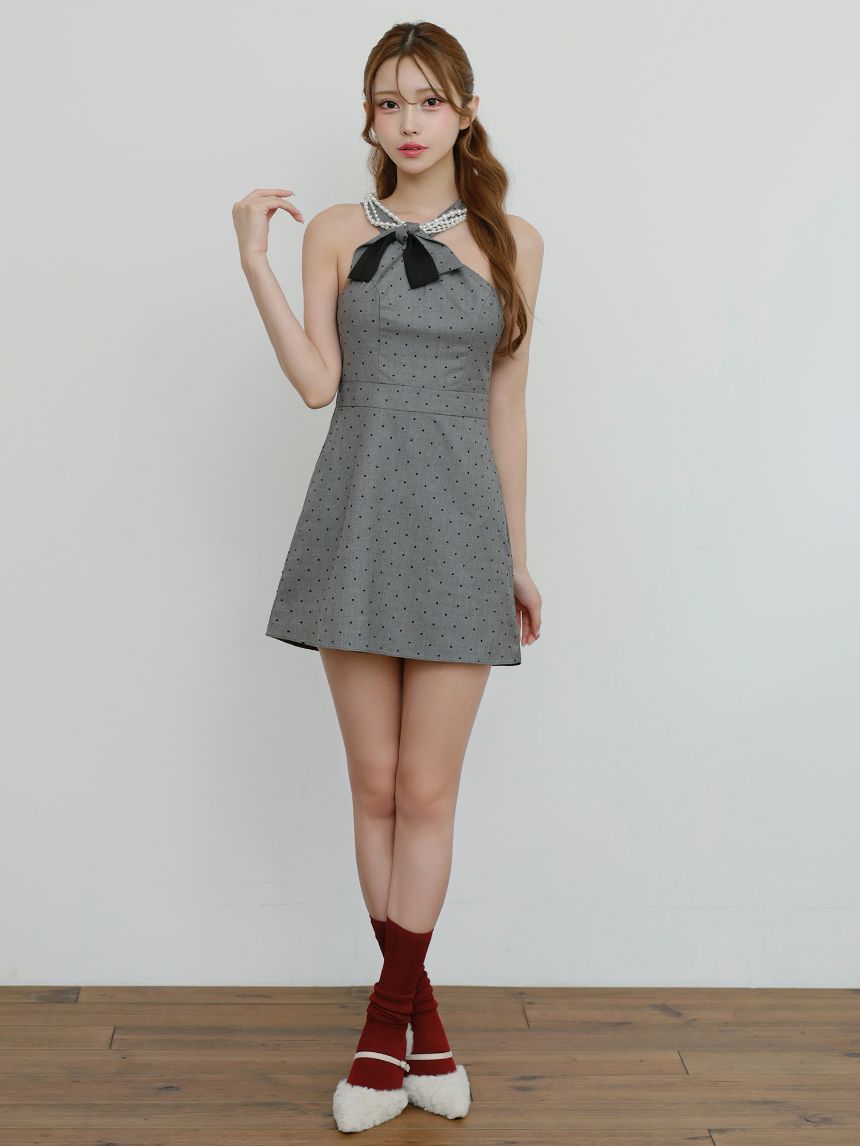 XSサイズあり【ANGEL R/エンジェルアール】デコルテリボン/ アシンメトリーデザイン/ パールチェーン/ ドット/ フレア/ ミニドレス/ キャバドレス[OF2] [AR25249-GY-S251020]